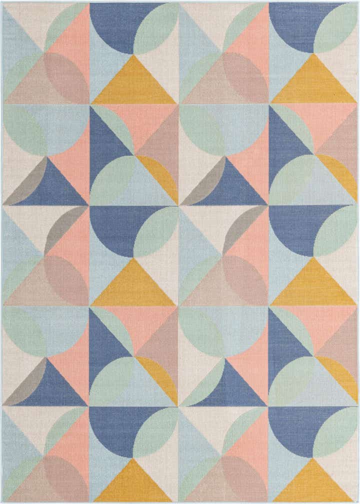 Machine-made of 100% polypropylene, this sample rug presents a rhythmic geometric pattern of triangles, half-moons and quarter-circles arranged in a repeating tiled grid. The multi background brings together beige, ivory and light blue fields while accents of blue, gold, light green and pink add lively contrast. The surface has a low-profile, tightly woven feel with a soft hand and subtle woven texture that lies flat underfoot.