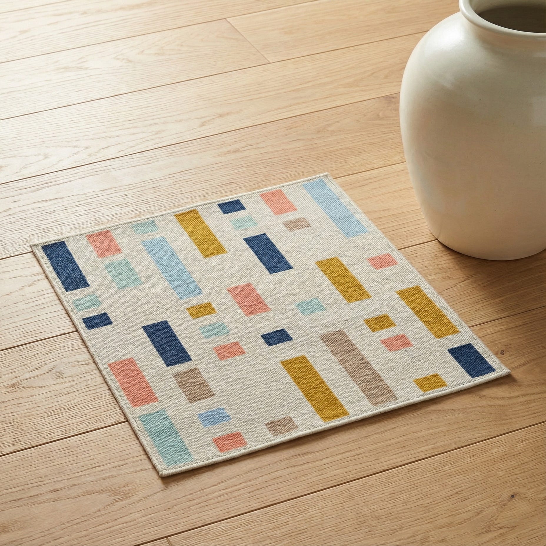 This sample rug presents a modern geometric layout of vertical rectangles and small squares arranged across a neutral multi background. The palette mixes rich blue and light blue with warm gold, soft pink, muted gray and pale mint, giving the design a balanced, playful rhythm without overwhelming the space. Machine made from 100% polypropylene, the surface has a low-profile, smooth hand with subtle woven texture that reads like a flatweave while offering consistent color and definition in each block.