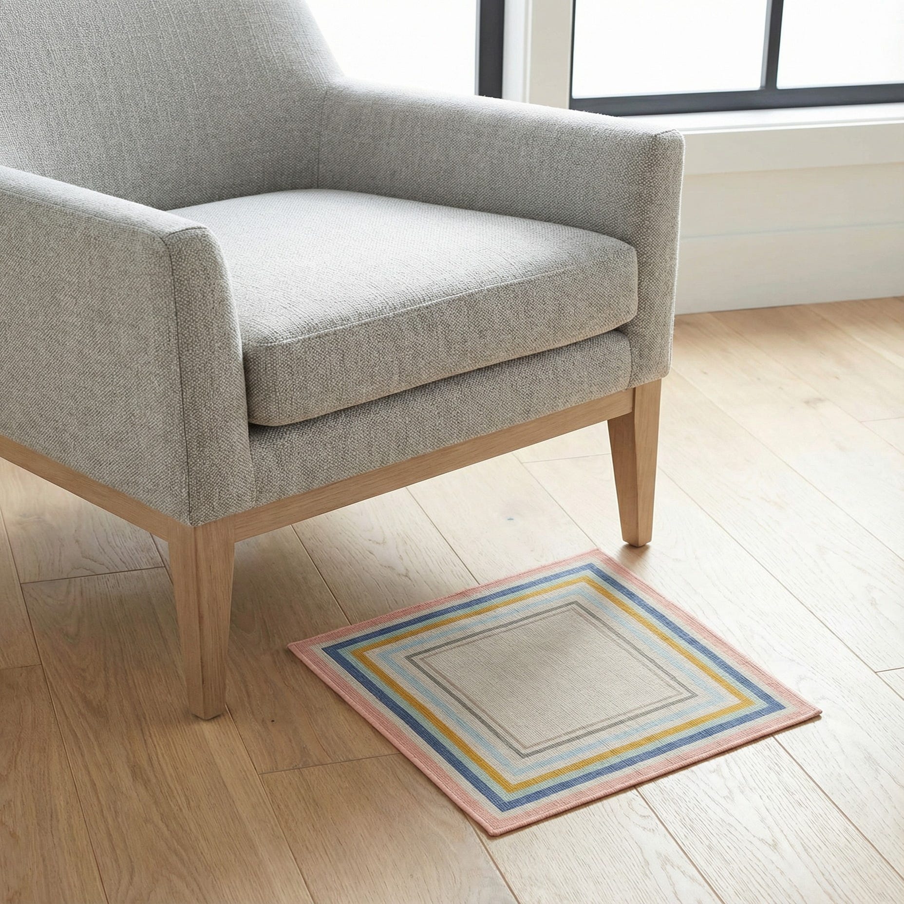 A series of crisp, concentric stripes frames a broad, neutral field in this machine-made rug. The pattern is clean and geometric—layers of blue, light blue, gold, gray, light brown and pink form a multicolored border that sits against an ivory-centered background, creating a fresh, organized look. The surface is low-profile and tightly woven from 100% polypropylene, with a smooth, slightly soft hand and a subtle sheen that catches light without heavy texture. This piece is a sample.