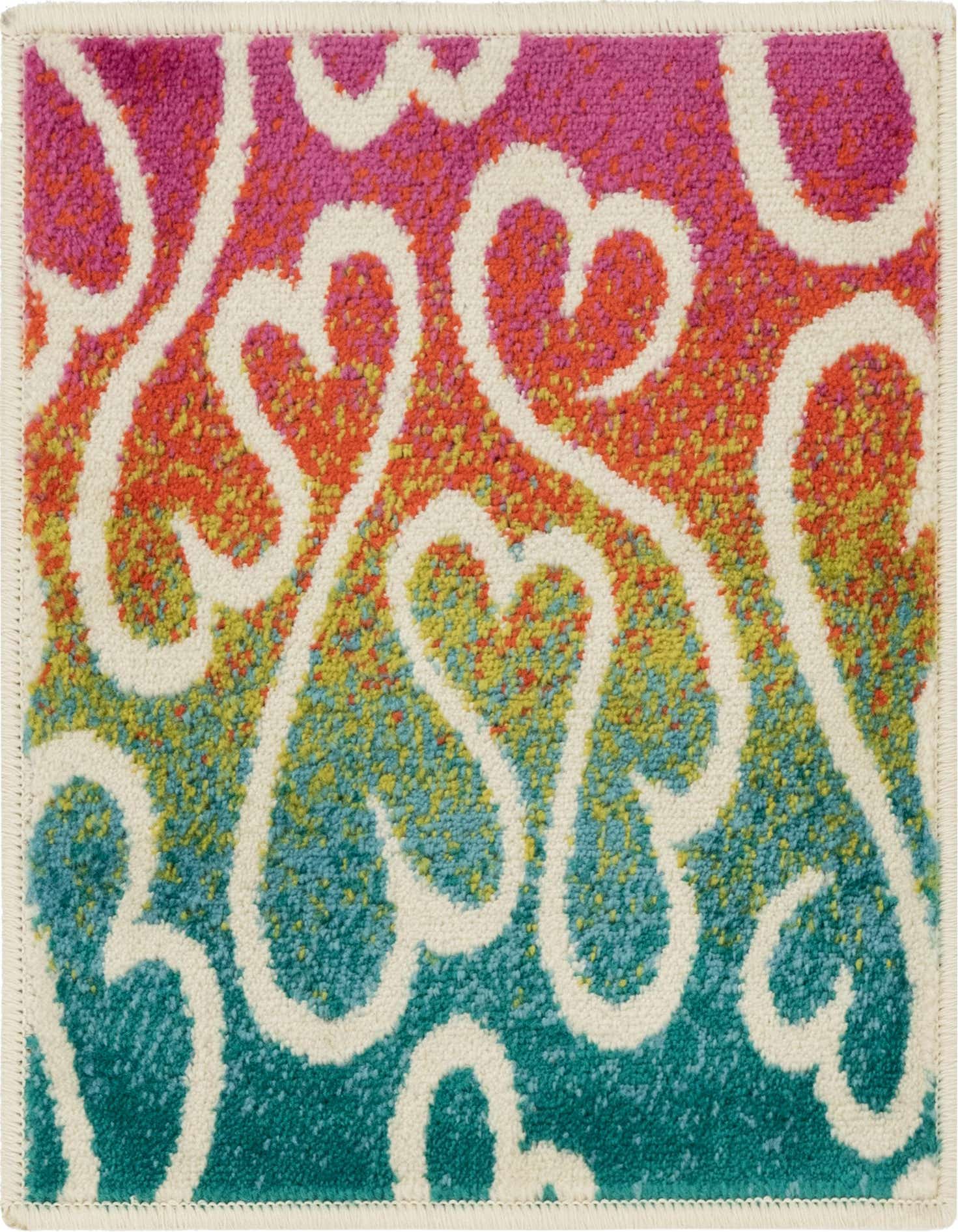 A vibrant 1' 8 x 1' 8 sample rug featuring an abstract heart and swirl pattern in fuchsia, orange, teal, and yellow on a multi-colored background.