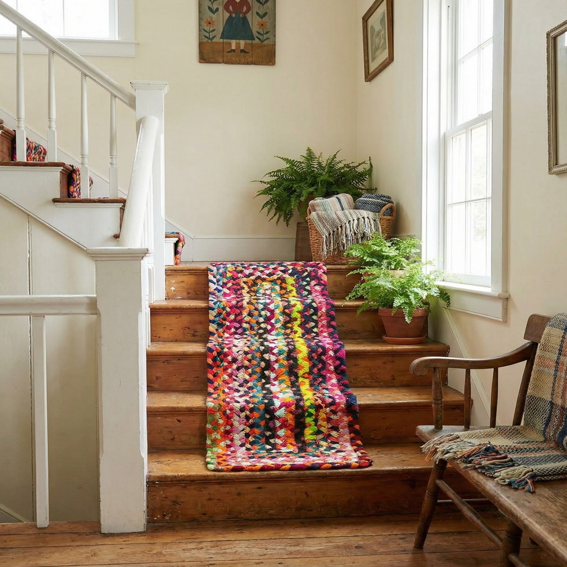 Place this stair tread on natural wood or painted stairs to add color and tactile interest without overwhelming the space. It works well in eclectic and bohemian interiors, cottage or farmhouse entries, and layered looks where mixed textiles and patterns are part of the scheme. Pair it with neutral walls and warm wood tones to let the colors pop, or use multiple treads to introduce a coordinated, spirited rhythm up a staircase.