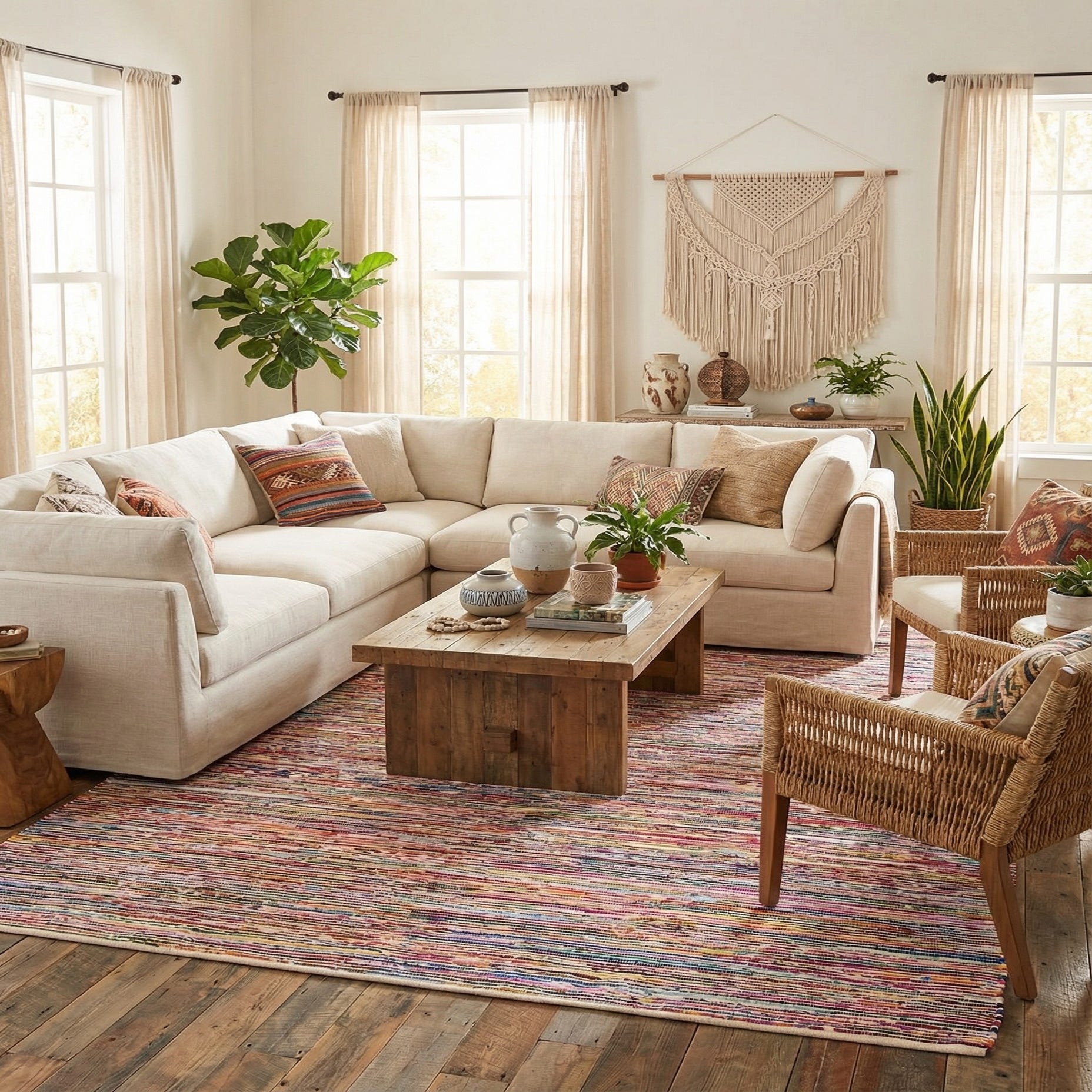 The linear, colorful design works well in casual, layered interiors — think coastal living rooms, bohemian lounges, modern farmhouse kitchens or an eclectic urban loft. Use it to anchor a seating group, add color under a dining table, or brighten a hallway; it pairs nicely with natural woods, rattan, painted white cabinetry, and neutral gray upholstery to introduce playful color without overwhelming the room.