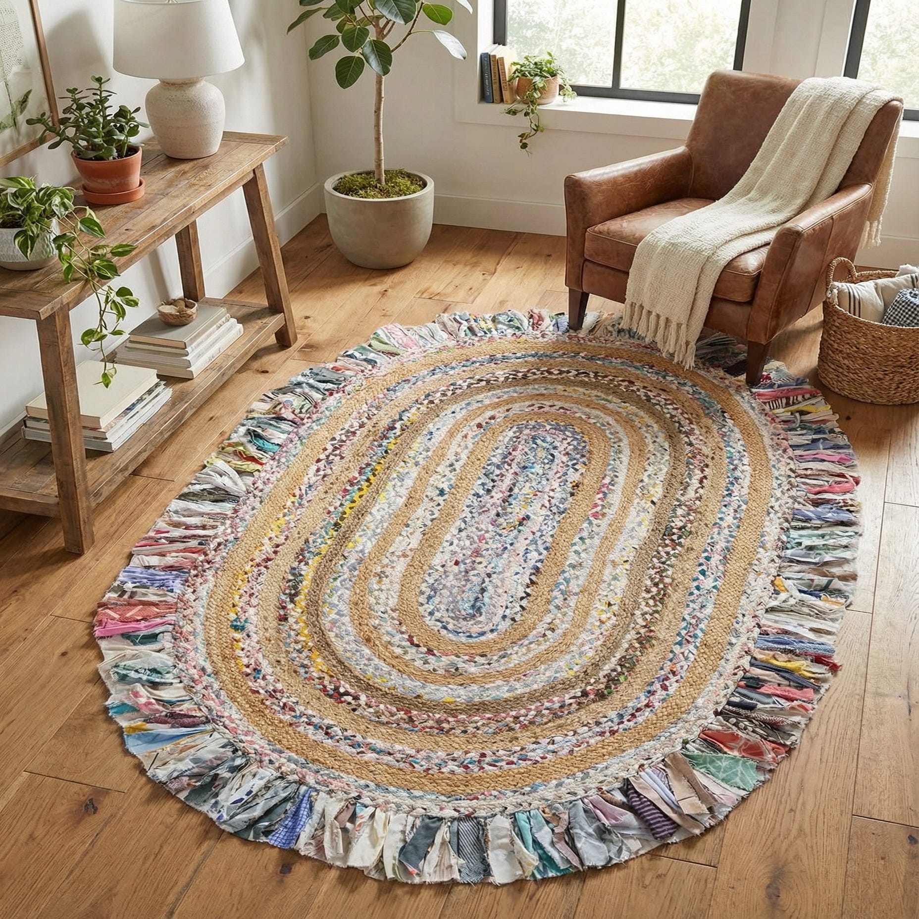 The surface feels firm underfoot with a textured, tactile quality where the coarse jute meets softer fabric strips—enough structure to anchor a space while offering visual warmth. Its oval shape and compact scale make it well suited for small-scale situations: an entryway, a kitchen or breakfast nook, a cozy reading corner, or layered beneath a small round table. The layered colors and natural fibers complement boho, coastal, cottage, and casual farmhouse interiors, and work equally well as a playful accent in eclectic or contemporary rooms.