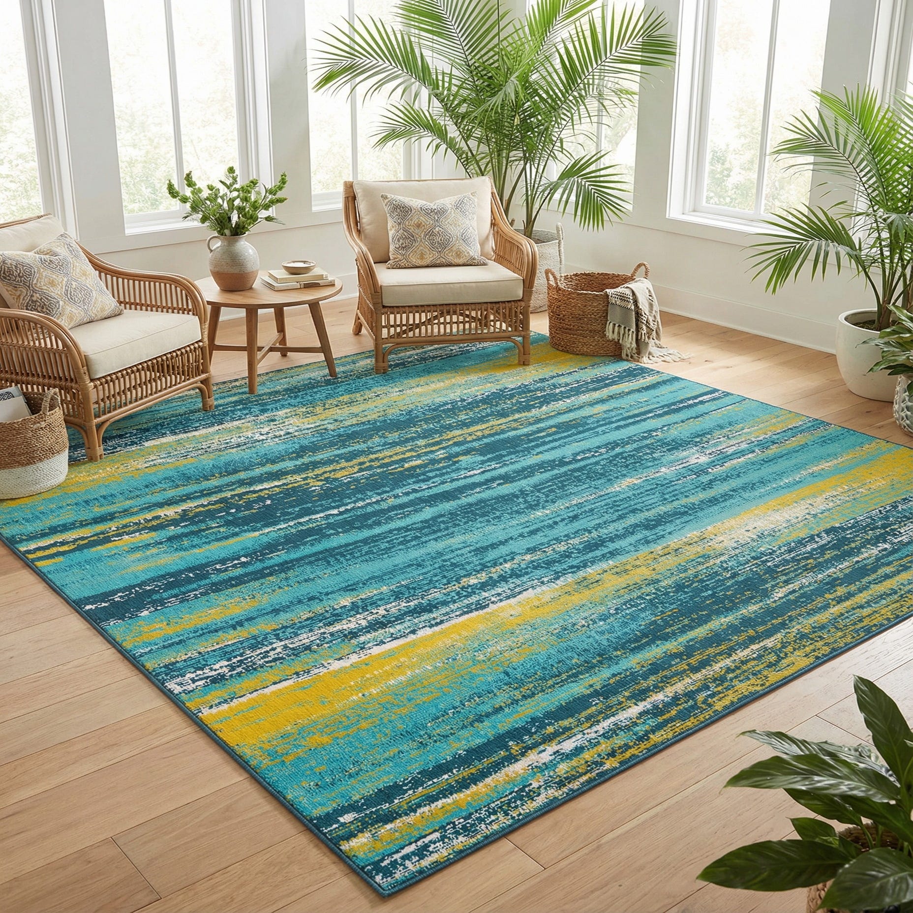 Place this rug under a dining table on a covered patio, anchor a sunroom seating area with neutral linens and natural wood furniture, or set it in a beach house living room to reinforce a relaxed, seaside palette. It pairs well with rattan or teak pieces, navy and ivory textiles, and bright accent pillows that echo the Yellow and Teal highlights for a cohesive, modern coastal look.