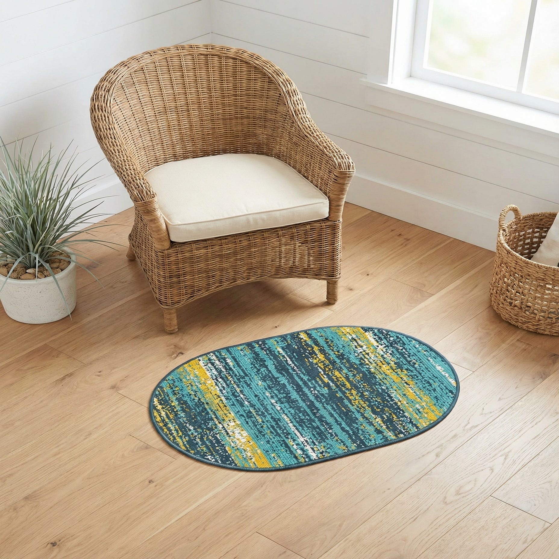 This rug pairs naturally with coastal and contemporary interiors — think light-wood furniture, rattan seating, crisp white linens, or navy and teal accents. Its oval shape softens angular rooms and works well under a bistro table, in a sunroom or covered patio, or layered over a larger neutral rug in a living area to add color and movement.