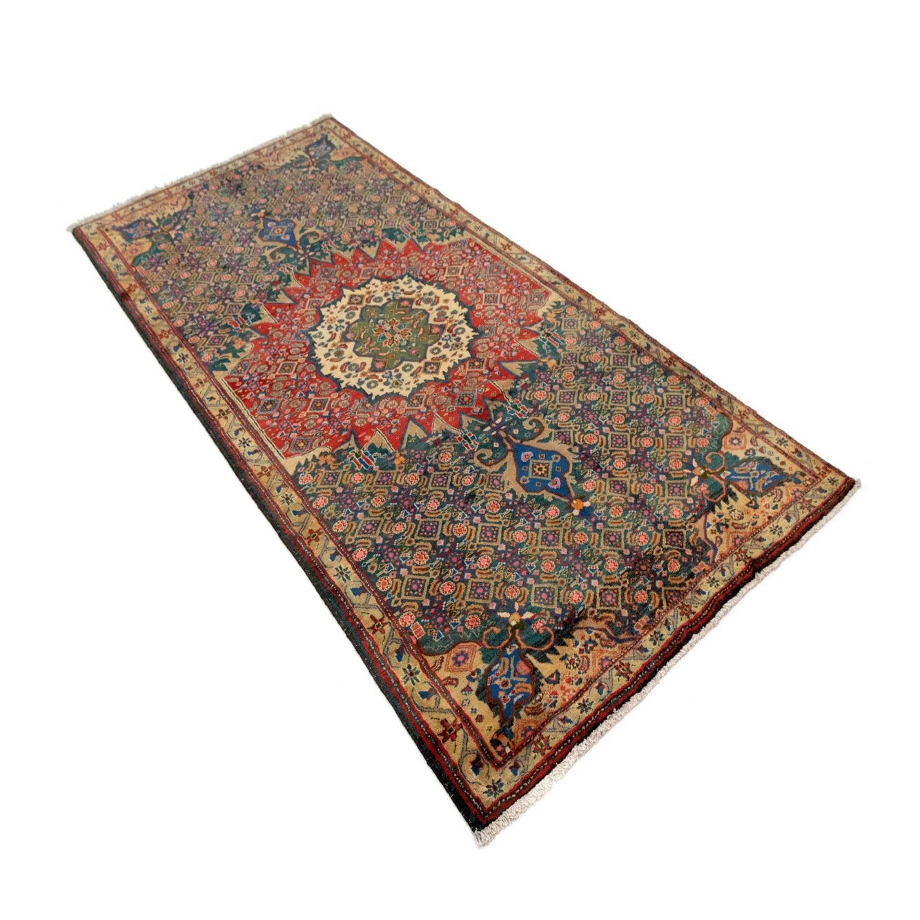 Multicolor Persian runner rug with a central medallion in red, green, and cream, surrounded by intricate floral and geometric patterns on a dark blue field.