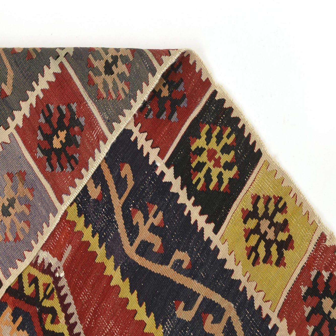 A handmade 10 ft runner rug with a vibrant multicolor geometric pattern, featuring red, navy, yellow, and black, ideal for a hallway.