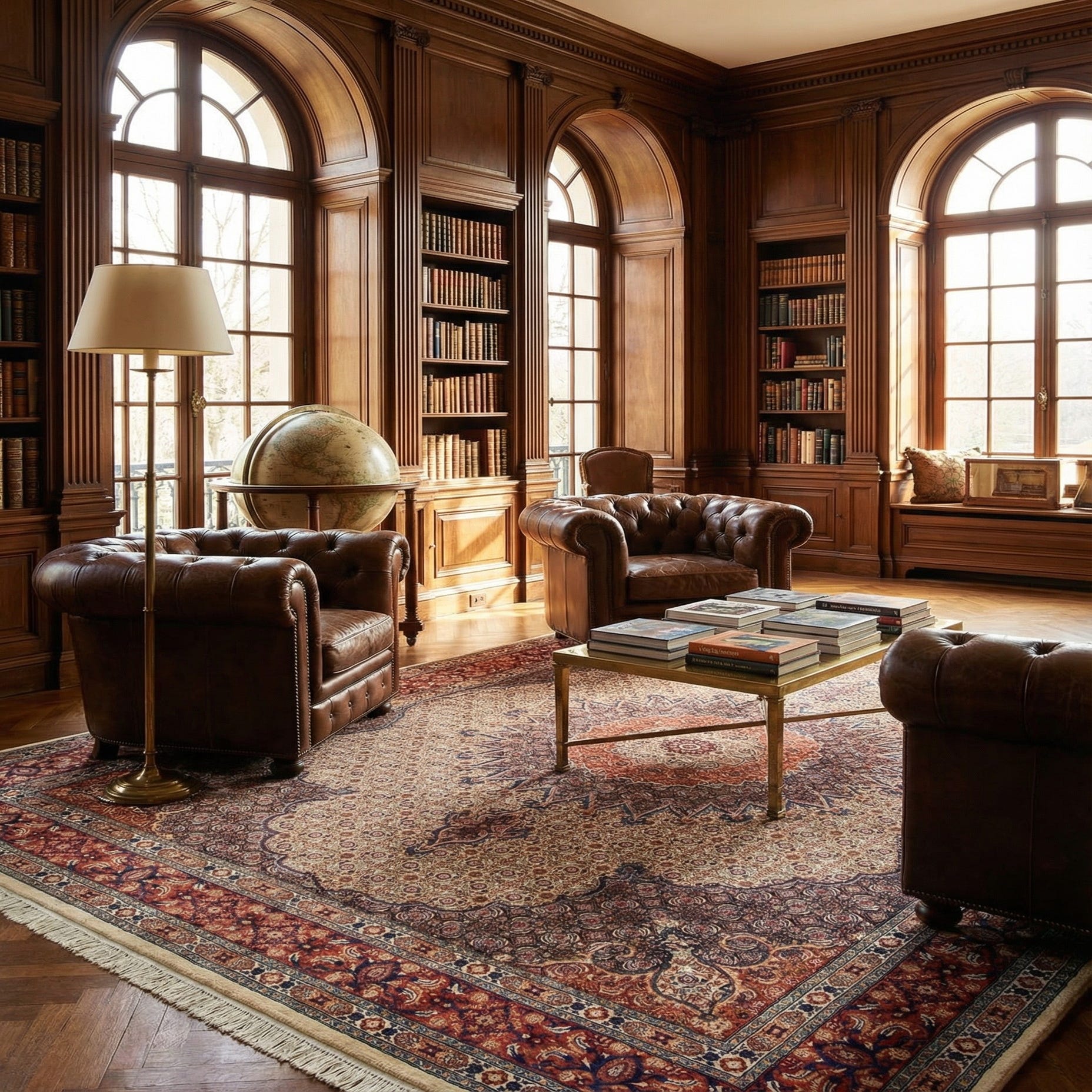 This rug would seamlessly complement interiors that lean towards the classic and traditional, providing a stately anchor to living rooms, dining spaces, or large entryways. It can also serve as a standout piece against more modern decor, adding character and a sense of timelessness. As a substantial piece, it would best suit spacious areas where its intricate design and craftsmanship can be fully appreciated.