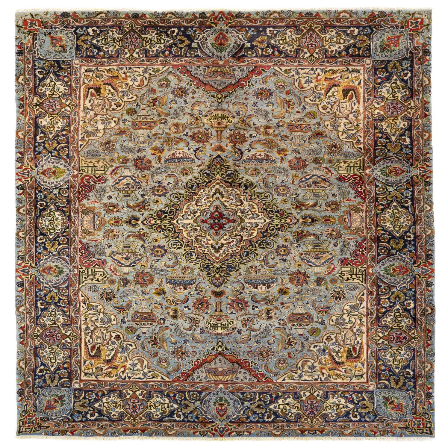 A traditional Persian medallion layout anchors this handmade 100% wool rug, with a detailed central medallion set into a busy field of scrolling vines, palmettes and small botanical motifs. The multicolor background blends soft blue tones with warm neutrals and is framed by a deep navy border punctuated by ivory, rust red, warm gold and olive accents. Fine motif work and layered color shifts create a composed, antique-inspired look that reads as refined patterning without overpowering a room.