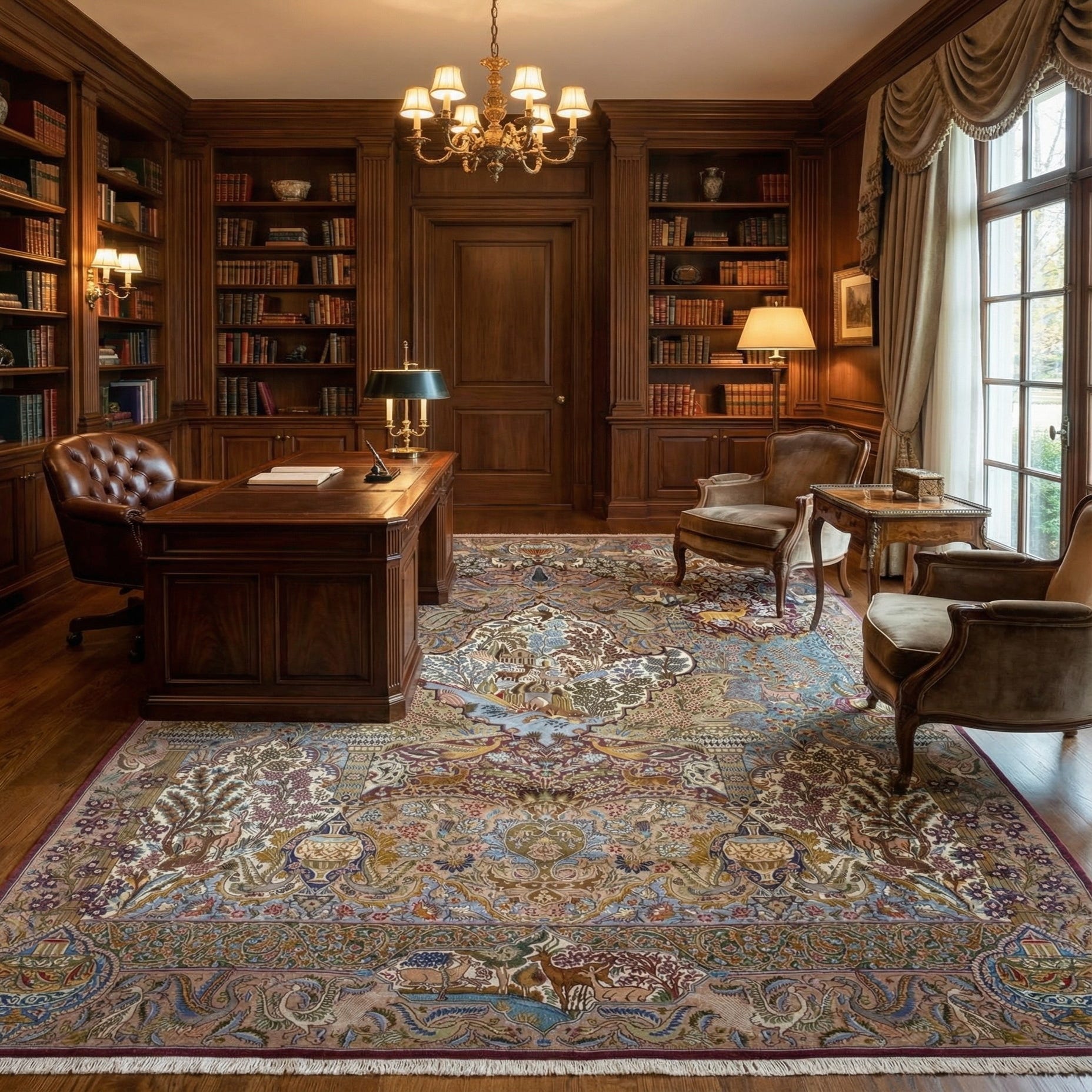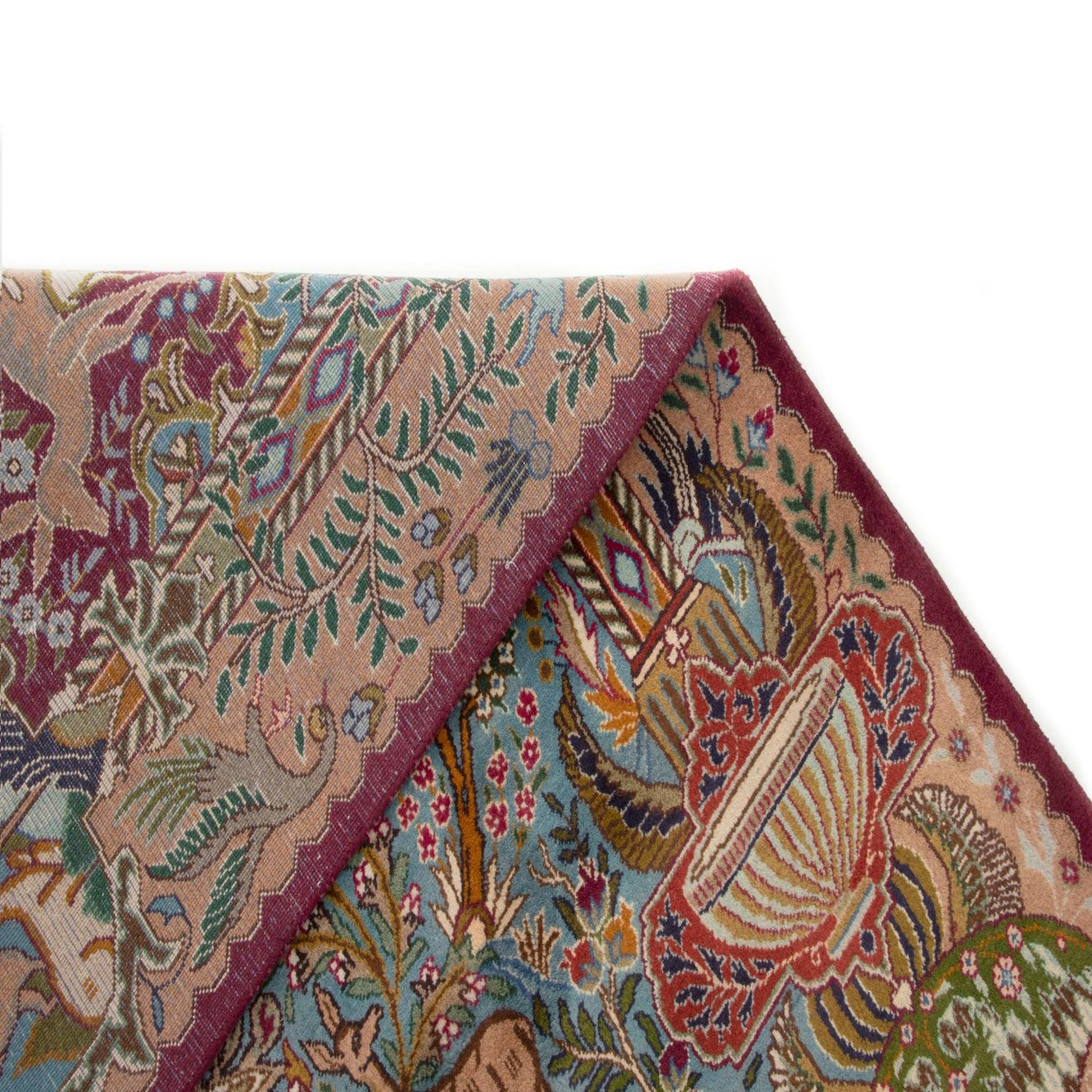 The rug boasts a detailed and intricate pattern that draws inspiration from classical designs. Its complexity and depth are notable, with motifs that suggest a garden scene brimming with architectural elements, florals, and wildlife. The overall aesthetic suggests a refined taste with a nod to historical grandeur.