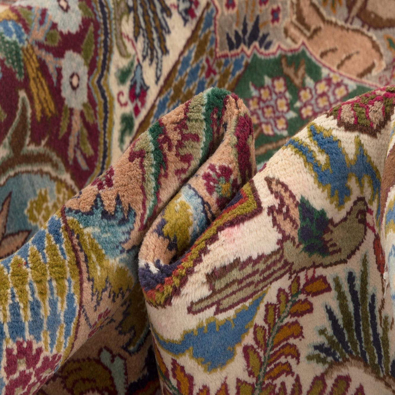 A large 10x13 rectangular Kashmar Persian rug in multicolor, featuring intricate deer, bird, and floral motifs.