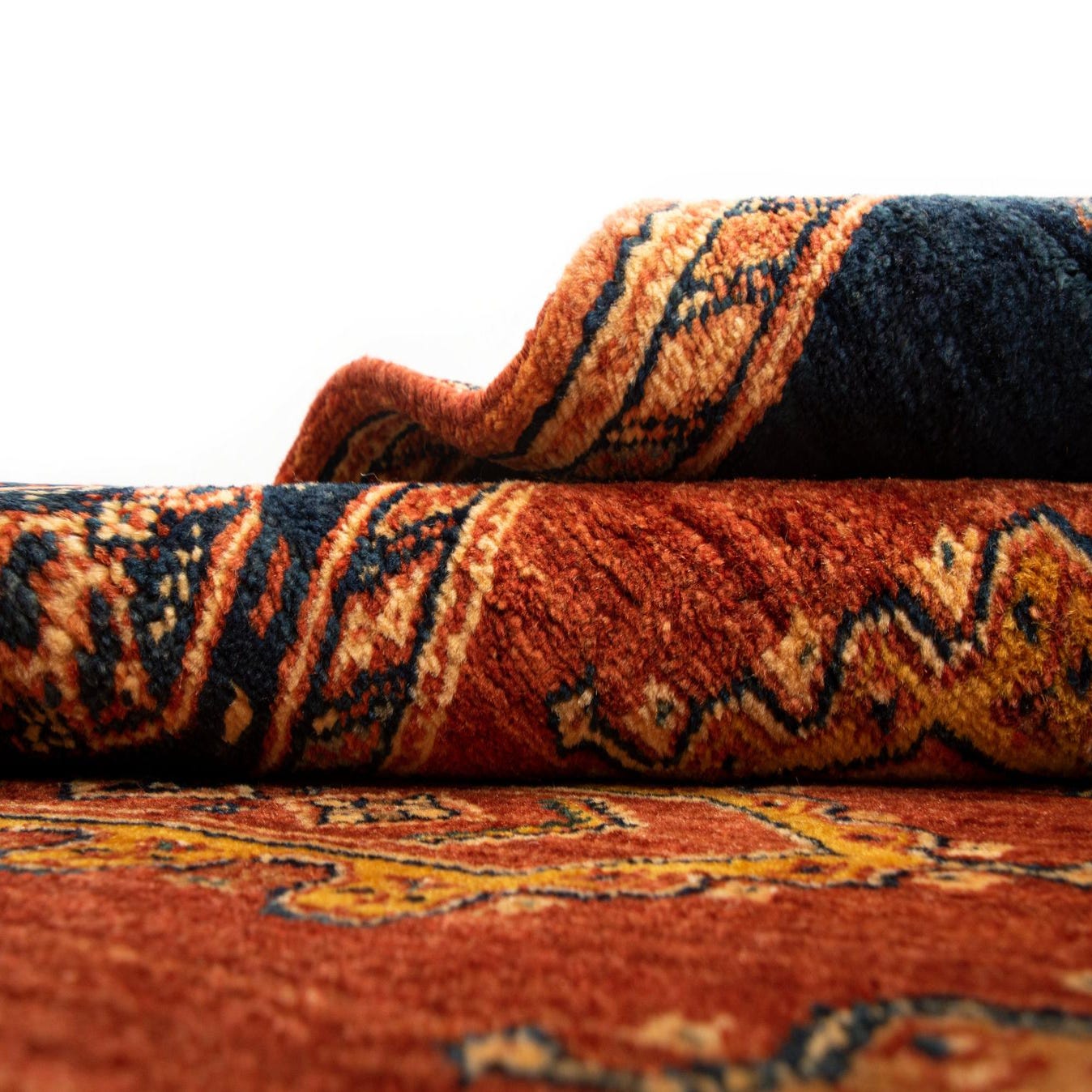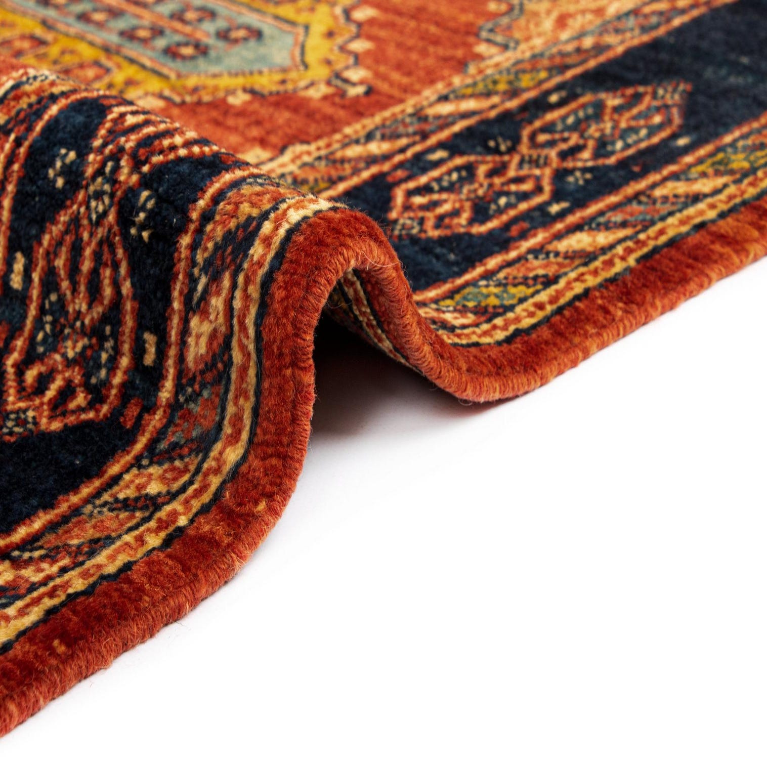The Luribaft collection offers a 13 Ft Runner, handcrafted from 100% wool, which lends a natural durability and softness to the piece. This runner displays a striking multicolor palette, with rich hues that interplay throughout its sophisticated design. Dark and light tones create a vivid contrast, highlighting an array of traditional motifs and geometric elements.