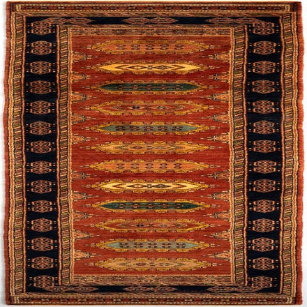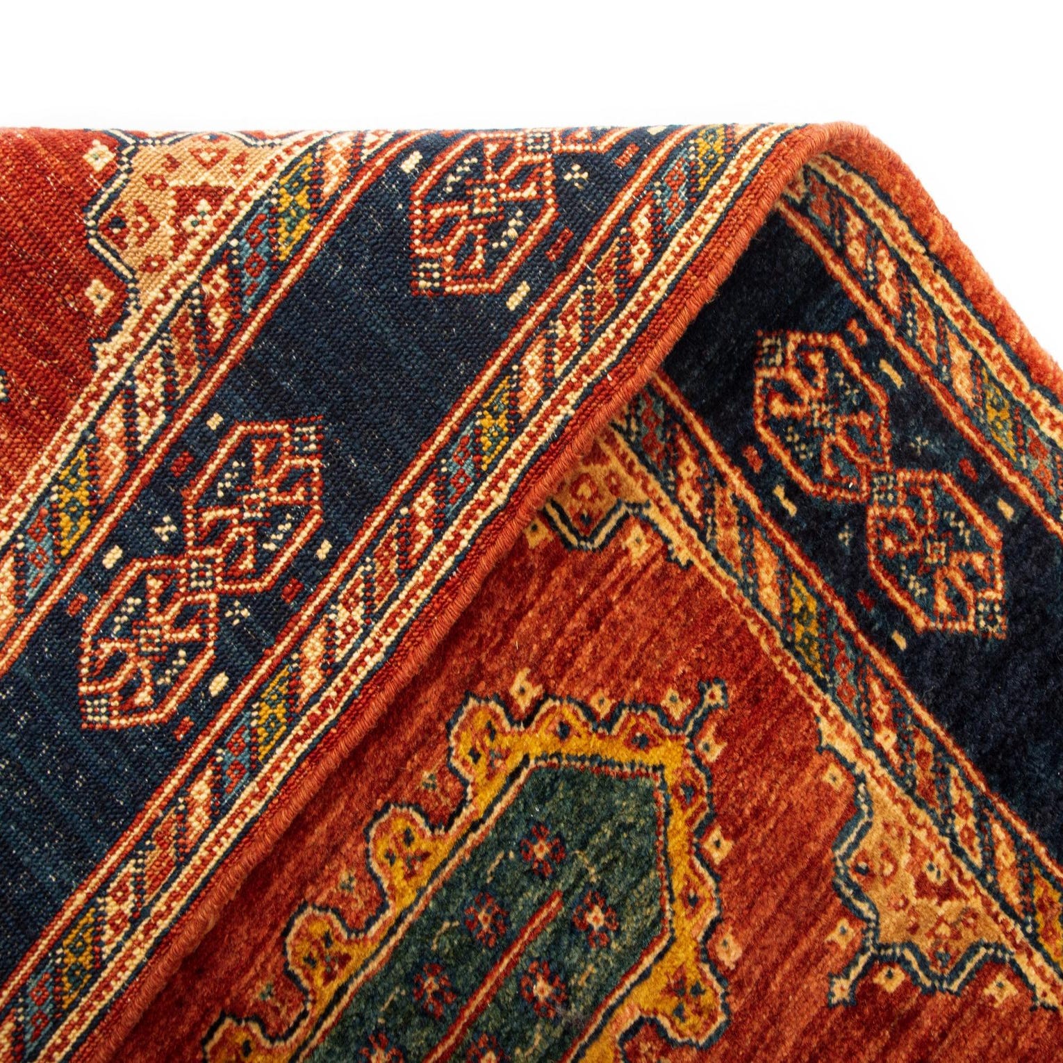 The rug boasts a bold central pattern of elongated diamond shapes, each intricately adorned with symbolic designs, flanked by detailed borders that incorporate floral and angular motifs. The blend of colors includes deep reds, earthy oranges, contrasting greens, and touches of beige and navy, harmoniously weaving together against a multicolor background.