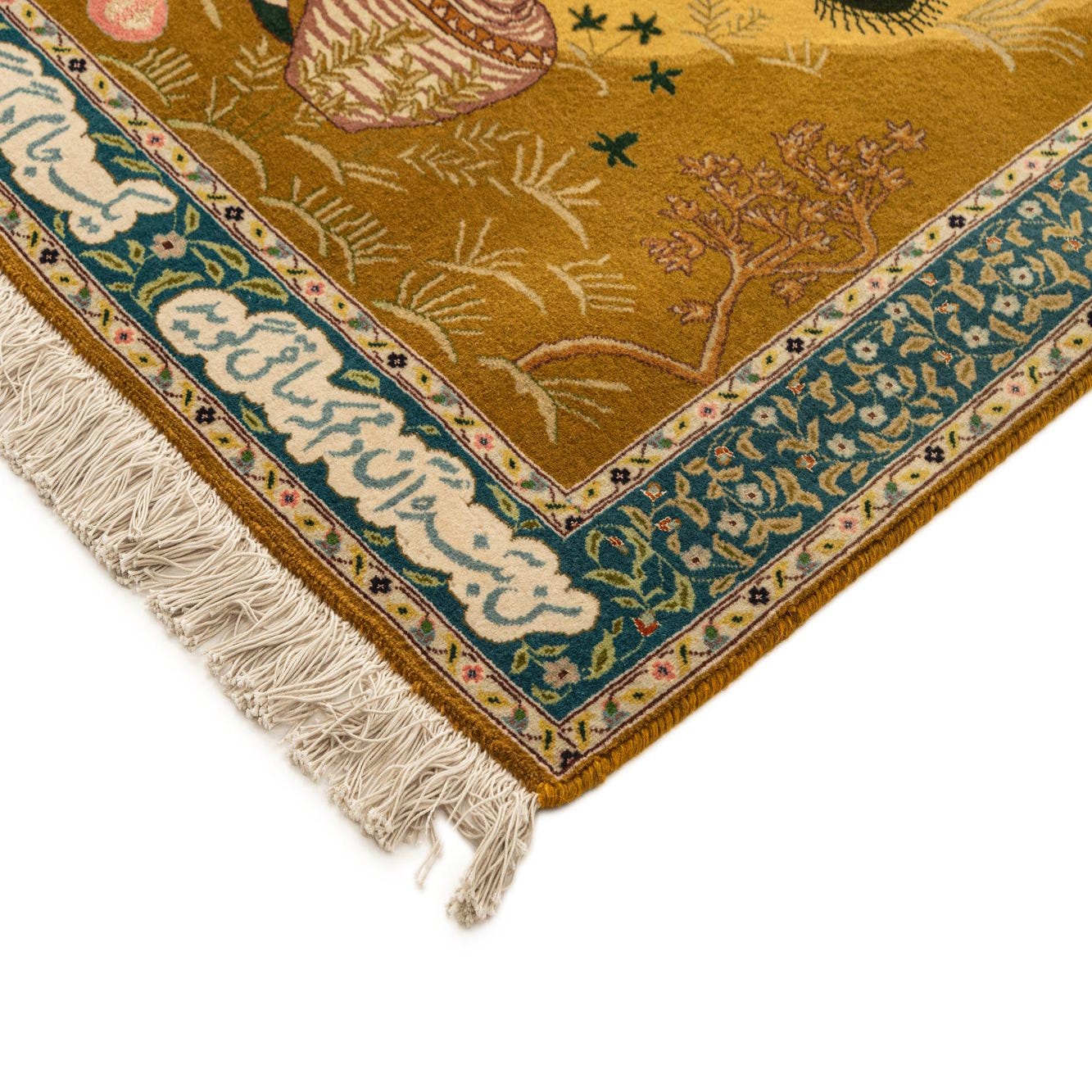A handmade 3x5 rectangular Tabriz rug featuring two figures in traditional dress, one standing and one seated, against a golden background with a teal floral border.