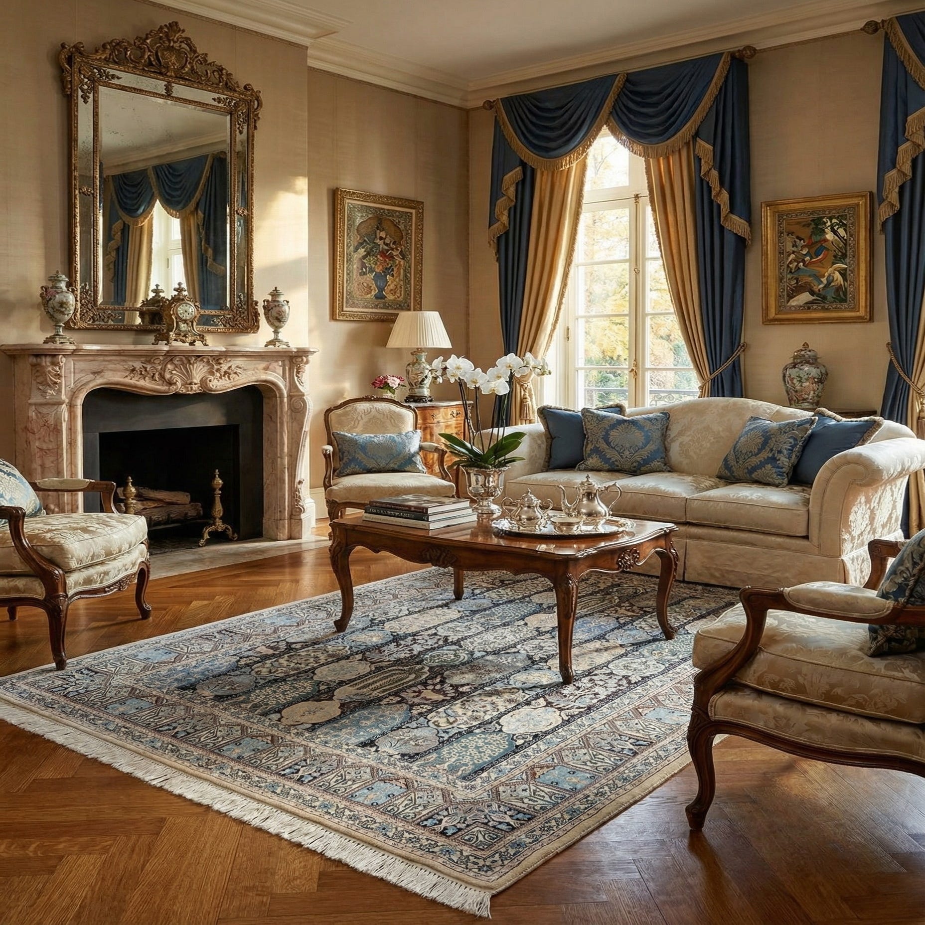 A 4x6 rectangular Multicolor Persian rug with intricate floral and animal motifs, featuring shades of blue, cream, and brown, suitable for a living room.