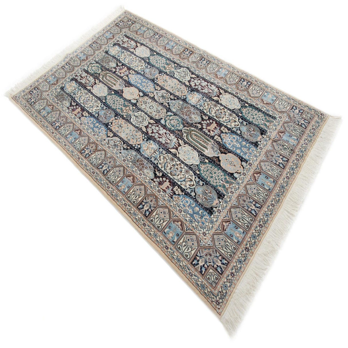 This Nain Collection rug is a hand-knotted piece crafted from wool with silk, offering an intricate pattern in a 4x6 dimension. Its pattern boasts a rich array of multicolored motifs, displaying a refined symmetry and intricate detailing that signifies the traditional craftsmanship attributed to the Nain design. The intersections of hues, from deep blues to creams and accents of tan, provide a versatile palette that can elevate a multitude of interior settings.