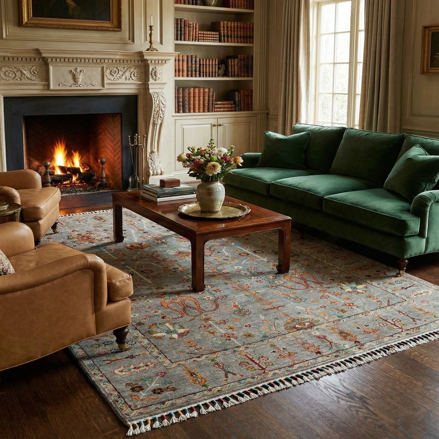 A 4x6 rectangular Rubin Persian rug in multicolor wool, featuring intricate floral and tree-of-life patterns on a gray background, with decorative fringes.
