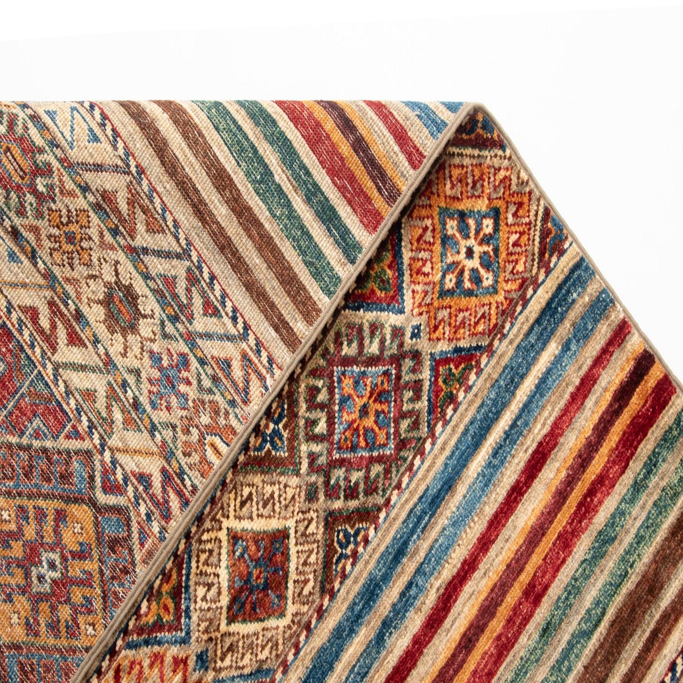 A rectangular 4x6 Multicolor Persian Torkman wool rug with intricate geometric patterns and striped bands in red, blue, green, and brown.