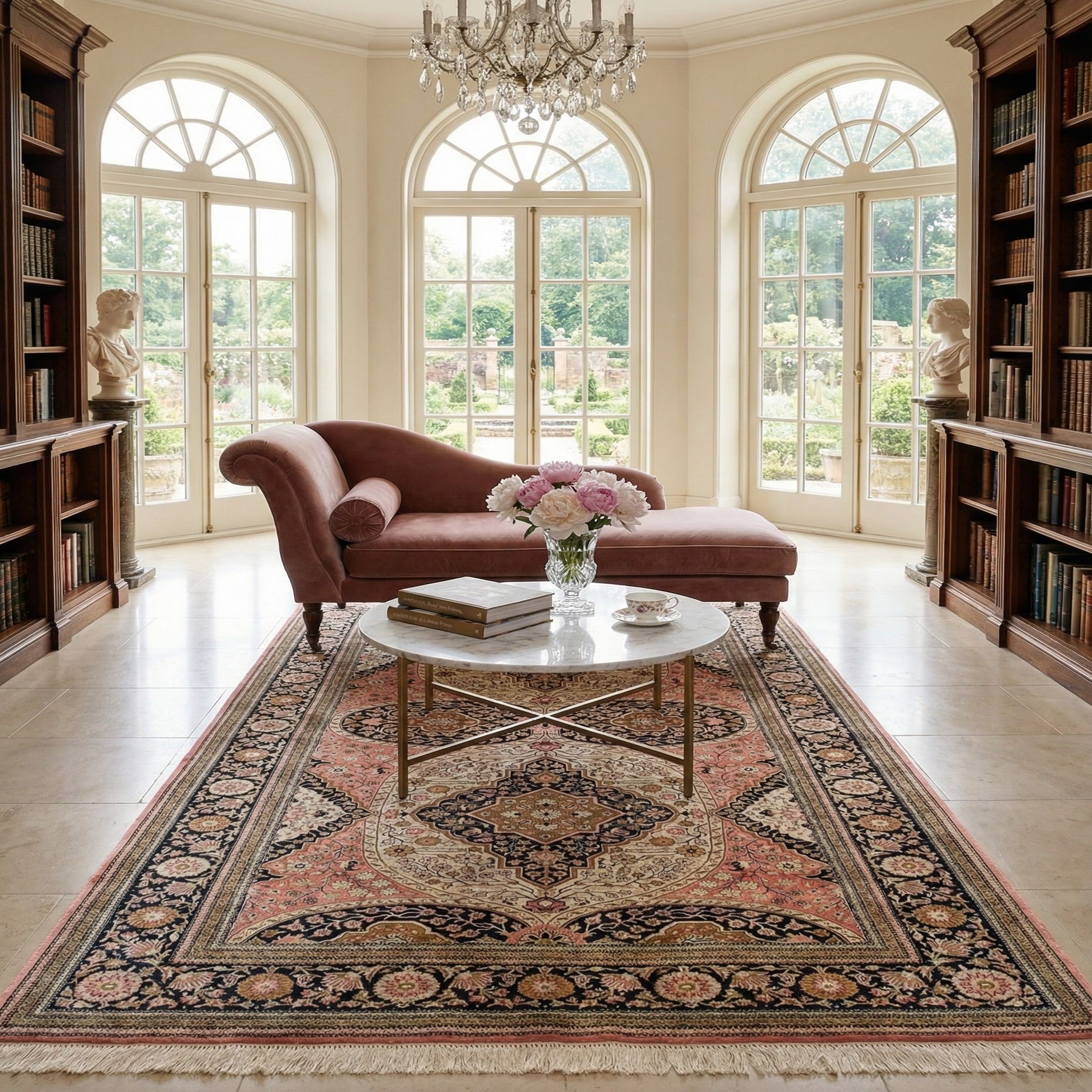 The piece is well-suited to traditional and transitional interiors and works equally well as an accent in more modern settings. Place it under a small seating grouping or in a reading nook to add pattern and sheen without overwhelming the room, layer it over hardwood to introduce warmth and texture, or position it at the foot of a bed or in a home office to bring a refined, low-profile surface to the space. Pair with warm wood tones, leather or muted upholstery to echo the coral and gold, or let it provide a patterned focal point against neutral furnishings.