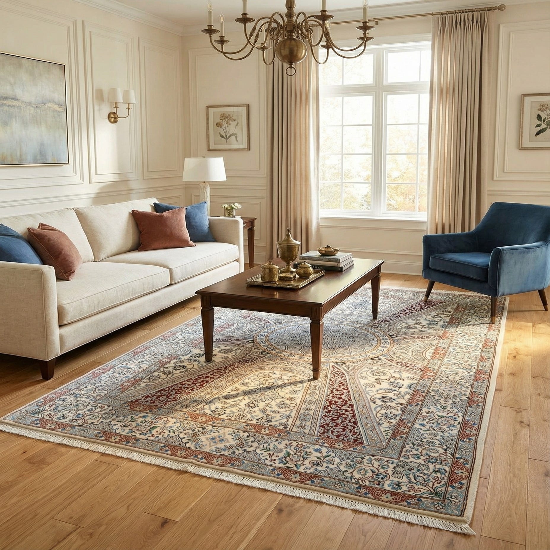 A 5x8 rectangular multicolor wool rug featuring an intricate traditional medallion and floral pattern on a cream background, with red and blue accents.