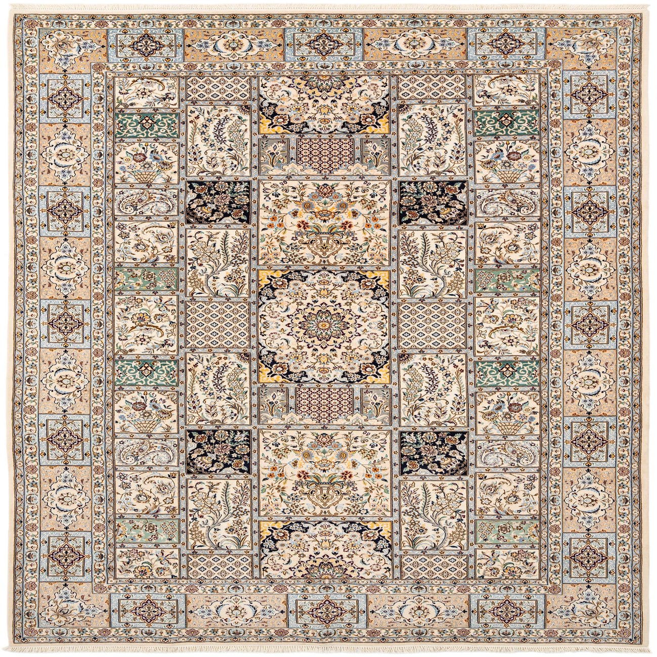 A 6x9 rectangular multicolor wool rug featuring a complex patchwork design with floral motifs and geometric patterns, ideal for a living room.