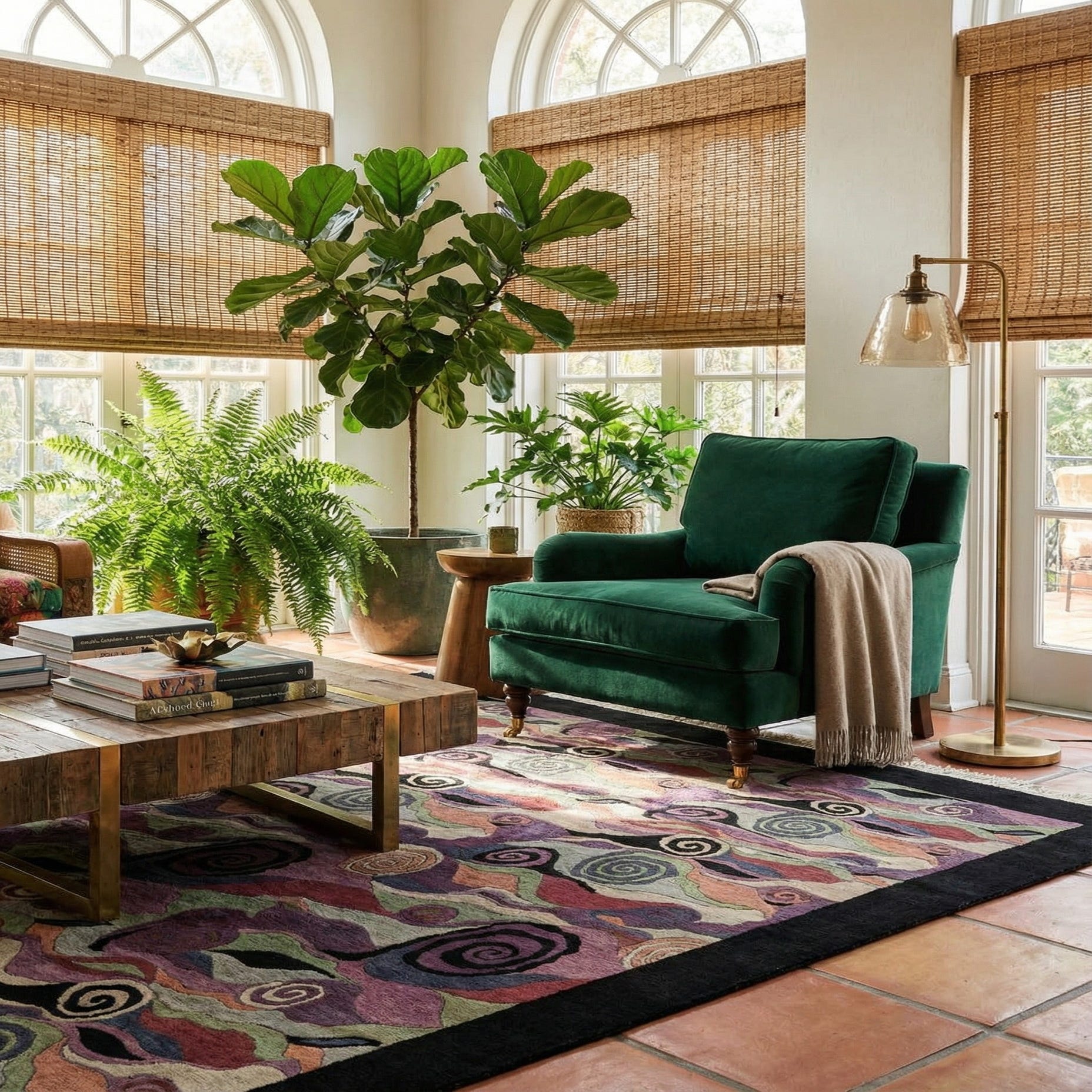 A 6x9 rectangular multicolor wool rug with a swirling abstract pattern and black border, ideal for a living room.