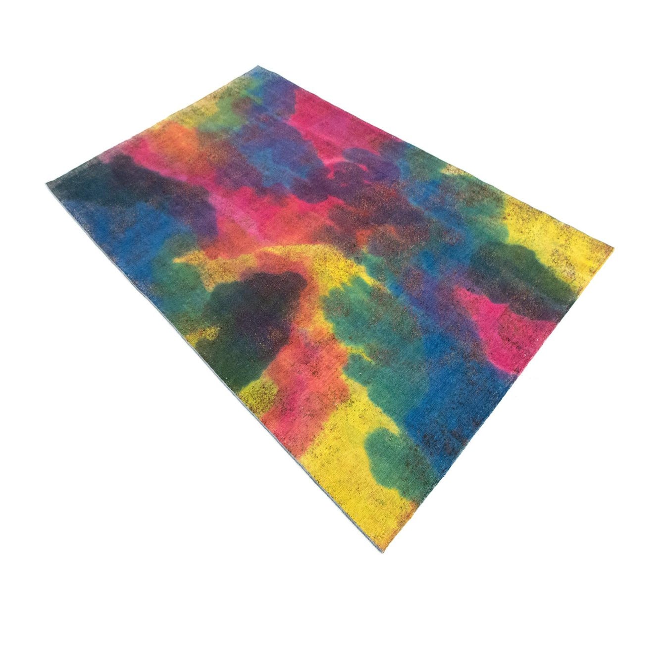 This Vintage Royal collection rug embraces a vivid, multicolor palette, with dynamic hues of red, blue, yellow, and green blending seamlessly across its hand-knotted wool surface. The 6x9 piece displays a daring abstract pattern, reminiscent of a painterly watercolor composition that gives it a fluid and expressive quality. The texture of 100% wool adds a layer of tactile comfort and artisanal craftsmanship.