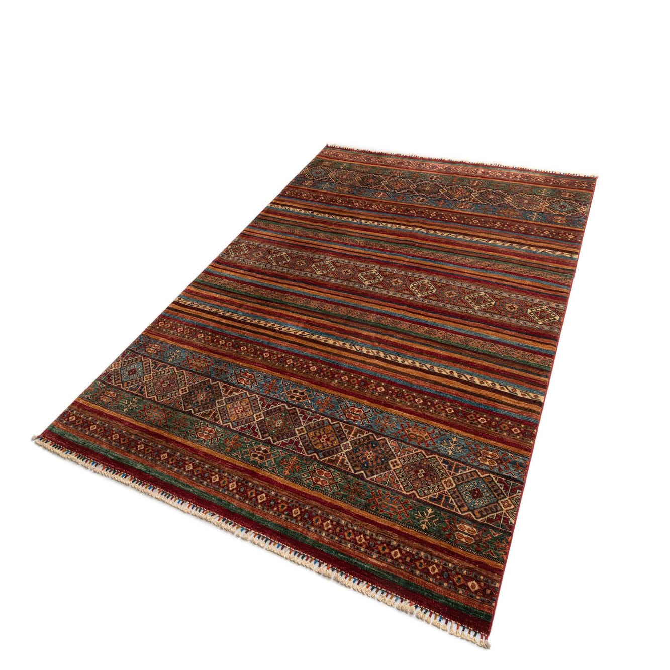 A 7x10 rectangular Ariana Persian rug in multicolor, featuring horizontal stripes and intricate geometric patterns, ideal for a living room.