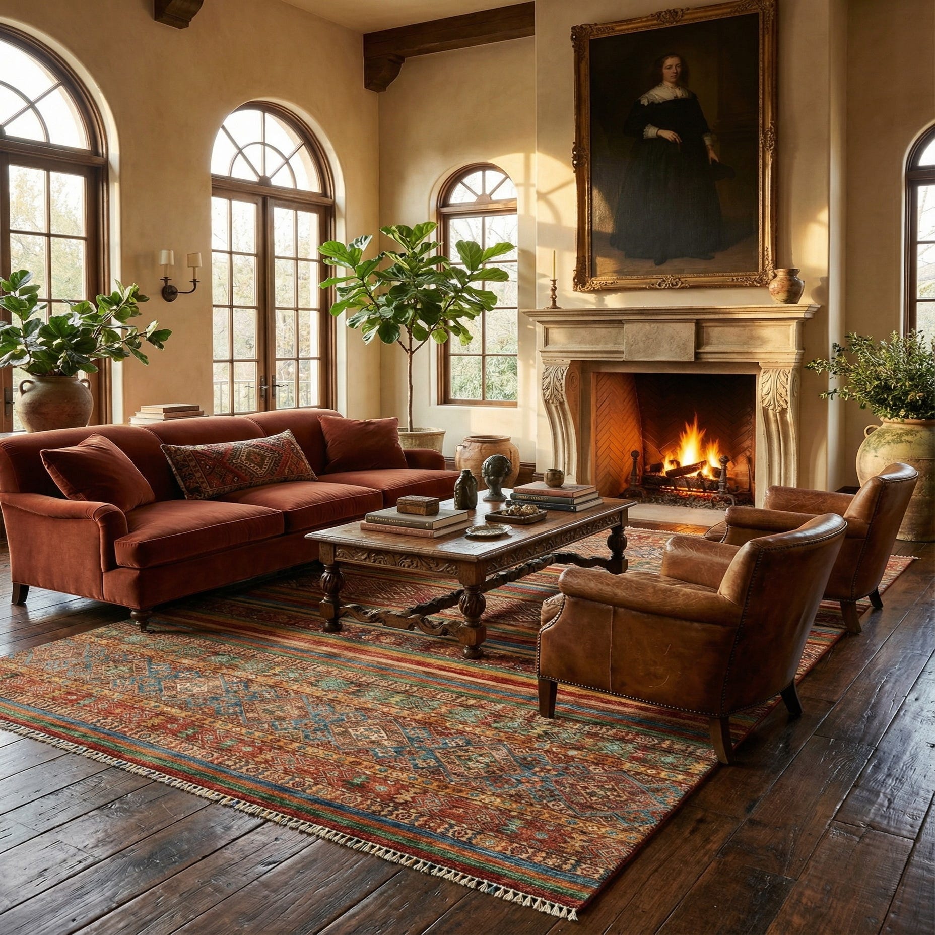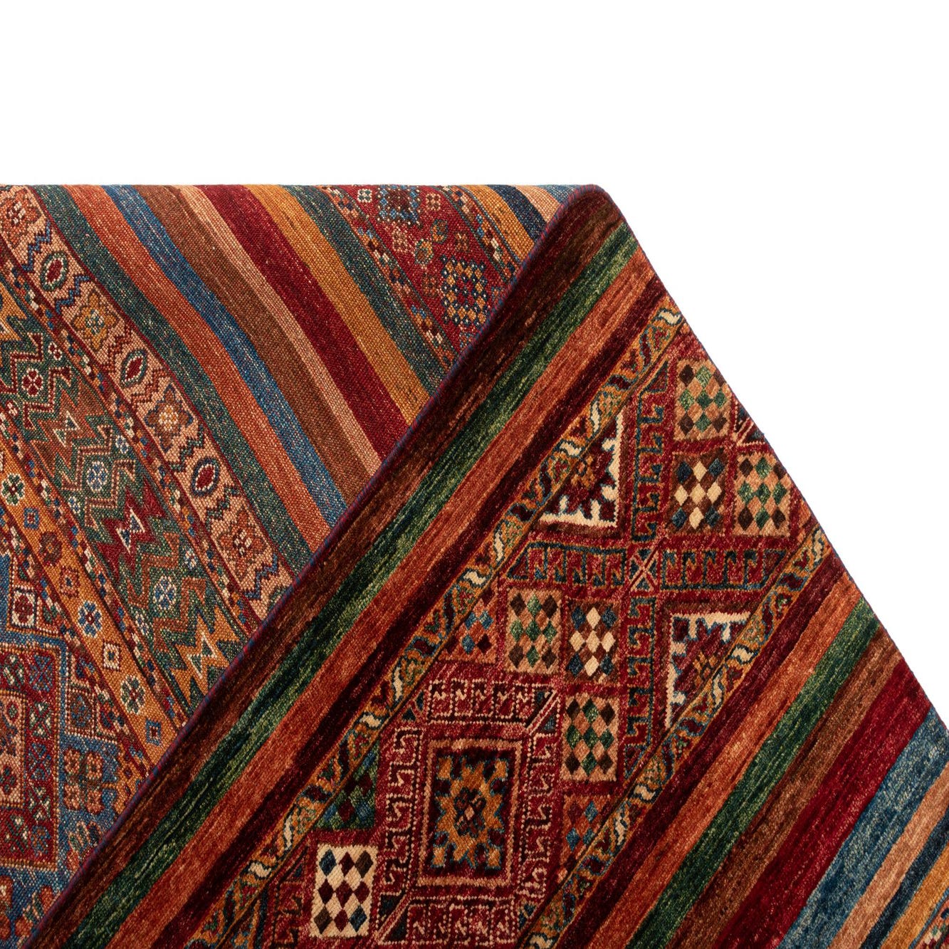 A 7x10 rectangular multicolor Persian wool rug with striped and geometric patterns, ideal for a living room.