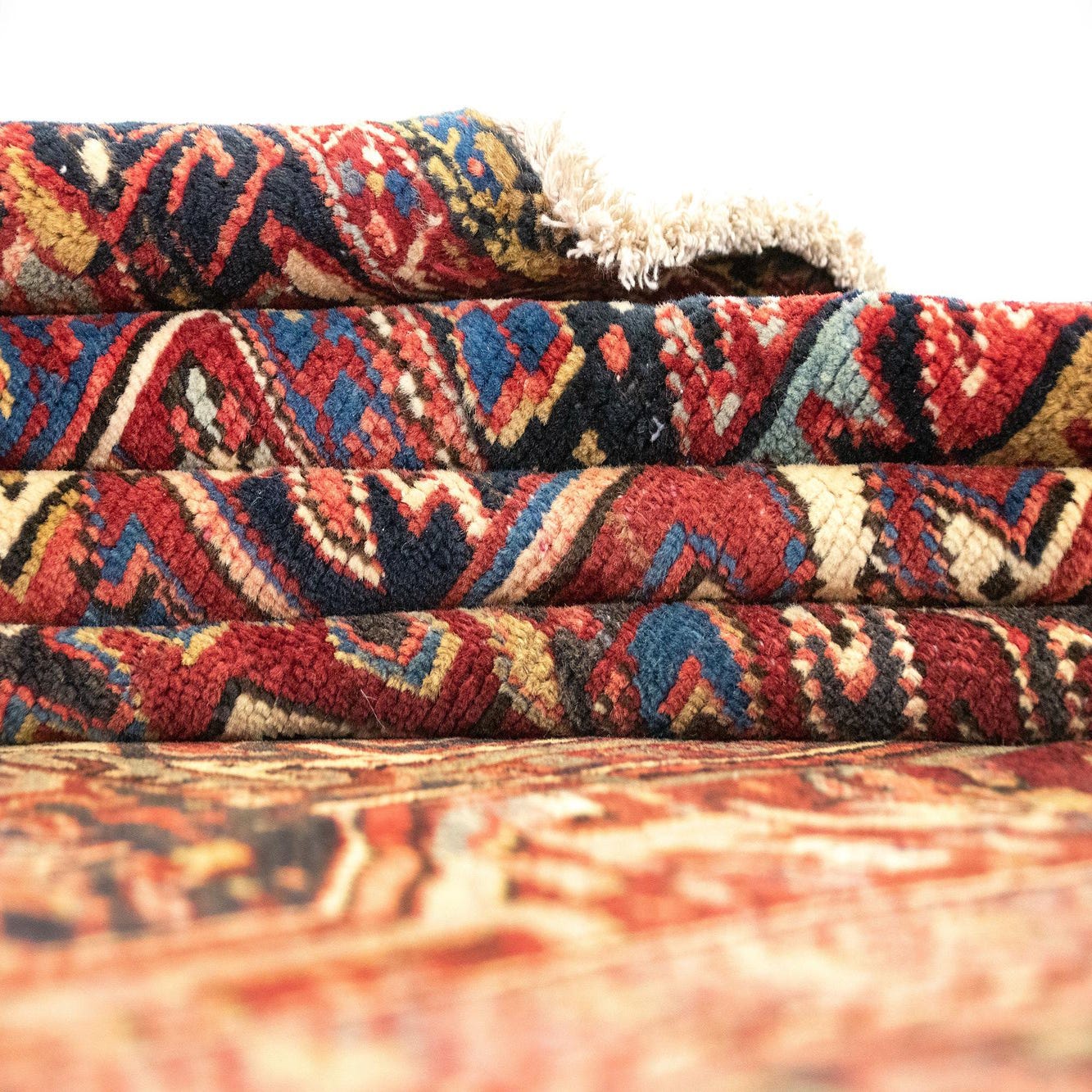 The Heriz collection presents a 9x12 hand-knotted rug crafted from 100% wool, offering durability and a plush feel underfoot. The rug showcases a symmetrical pattern that draws inspiration from traditional Persian motifs, which includes intricate geometrical and botanical designs. A rich palette of reds, deep blues, and accents of ivory and beige brings depth and warmth to the piece, set against a multicolored background that allows each color to make a distinct statement.
