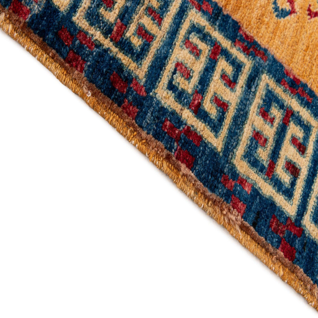 A 3x4 rectangular Ziegler rug in rich gold with a navy blue border featuring geometric patterns and red accents, handmade from wool.