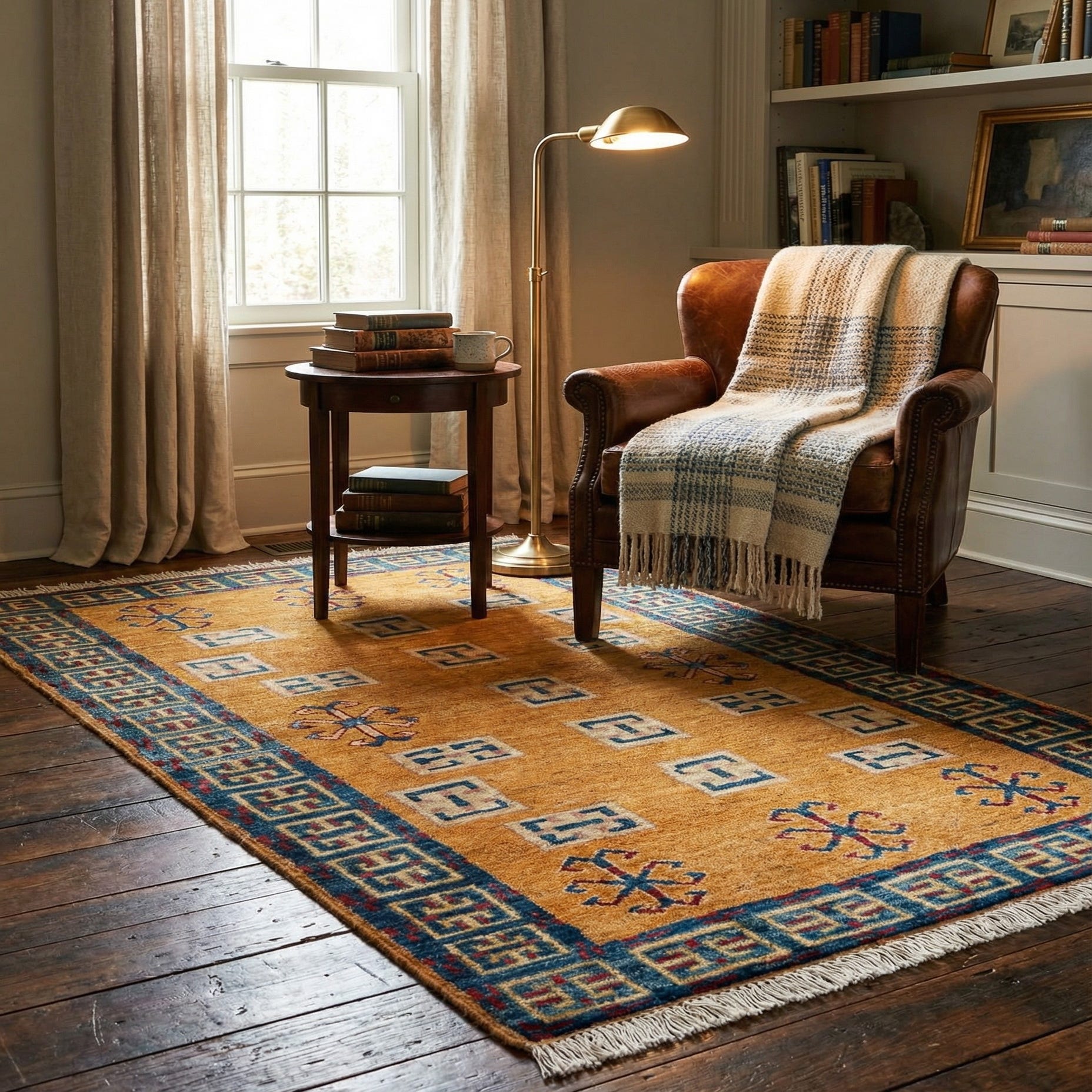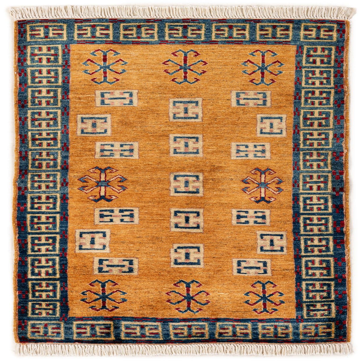 Primary color is Mustard Yellow. Colors in this rug include: Mustard Yellow, Blue, Black, Red.