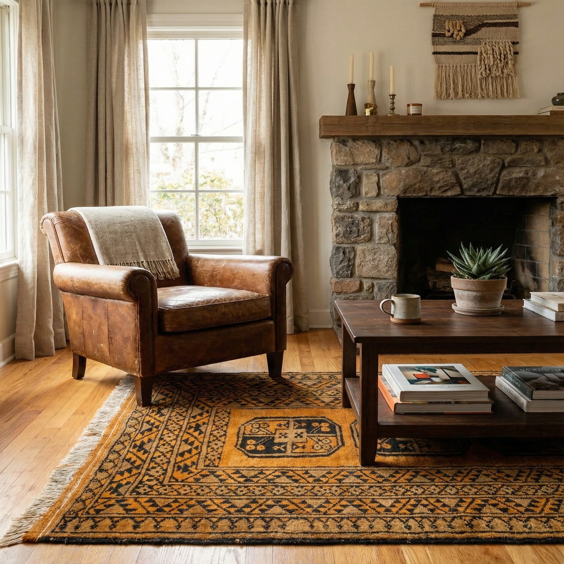 A 4x6 rectangular Afghan Akhche rug in yellows/golds with a traditional tribal pattern and fringe.