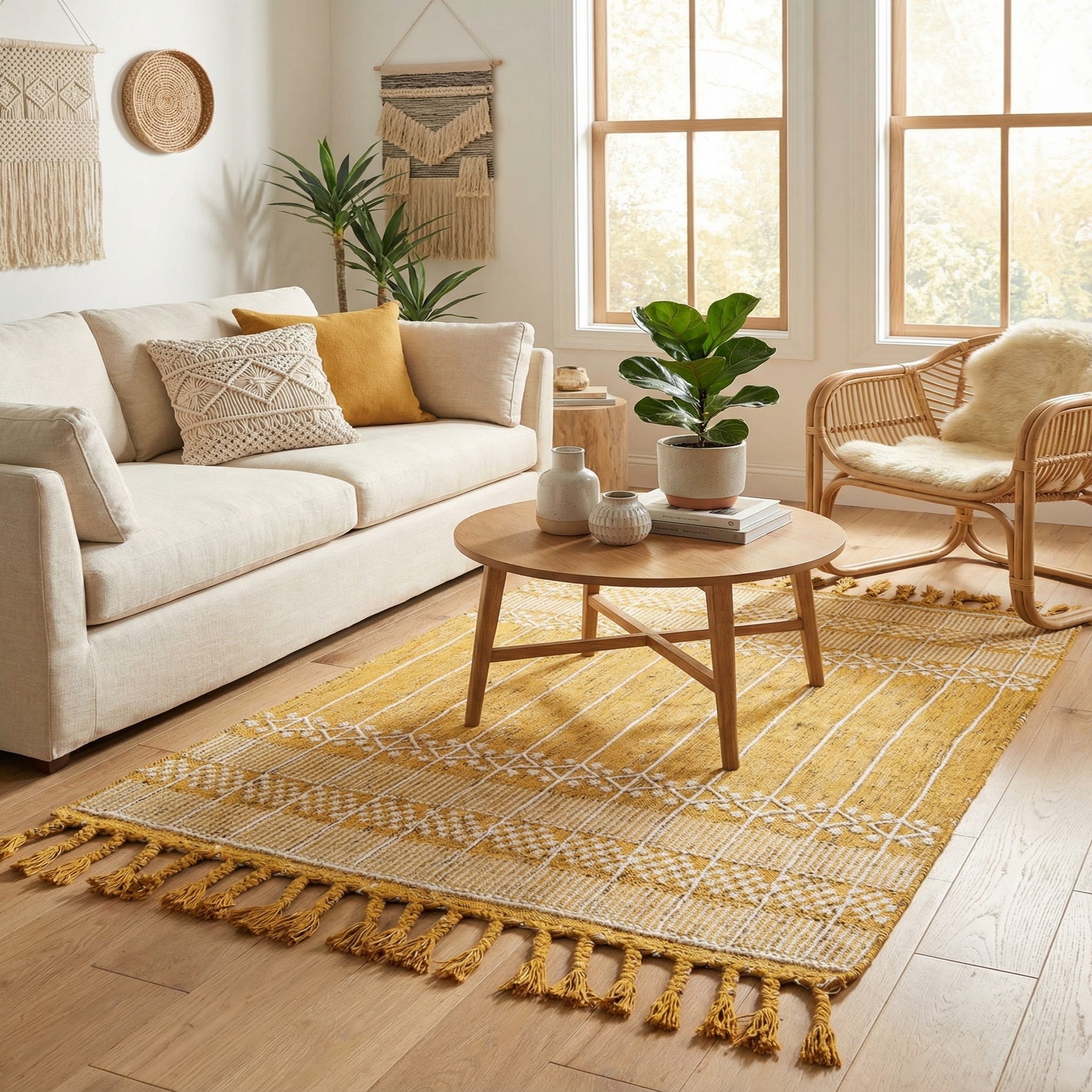 A 4x6 rectangular Eco Bohemian rug in yellow and white, featuring a modern stripe and geometric pattern with braided tassels.