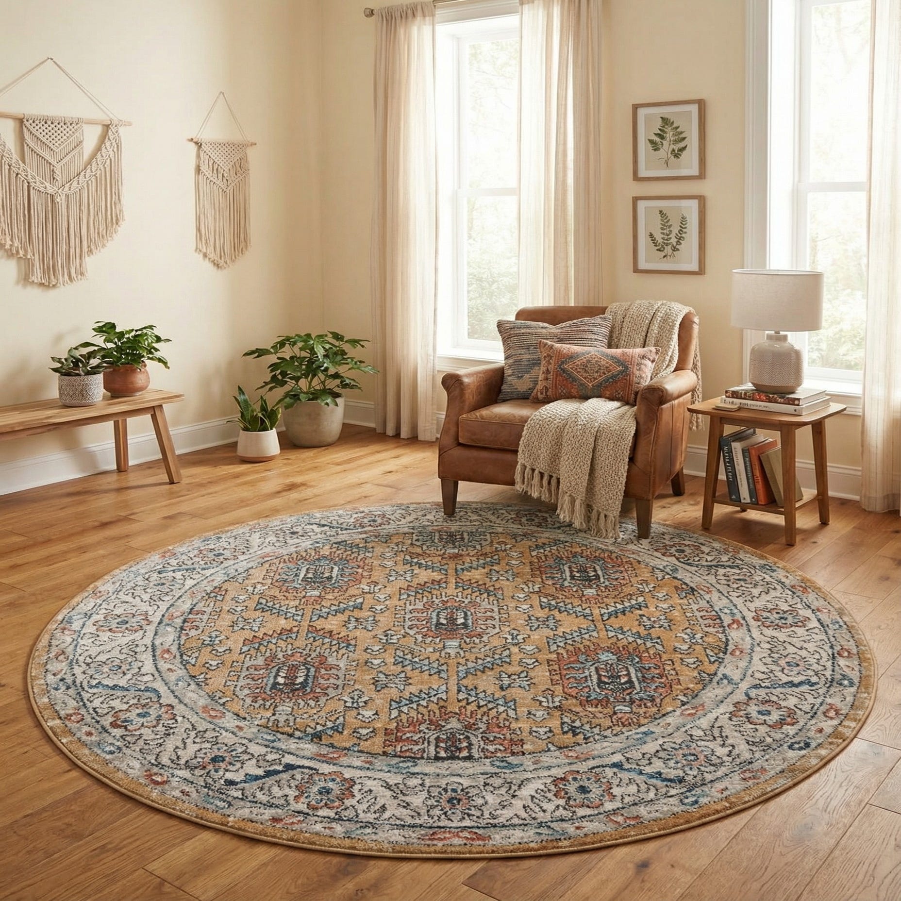 Place this round rug beneath a small dining table or in an entryway to anchor a welcoming vignette, or layer it in a living room reading nook to add color and pattern without overpowering the space. It pairs well with mid-century modern or transitional furnishings, complements warm wood tones and leather, and adds a cozy, patterned element to bohemian or farmhouse interiors.