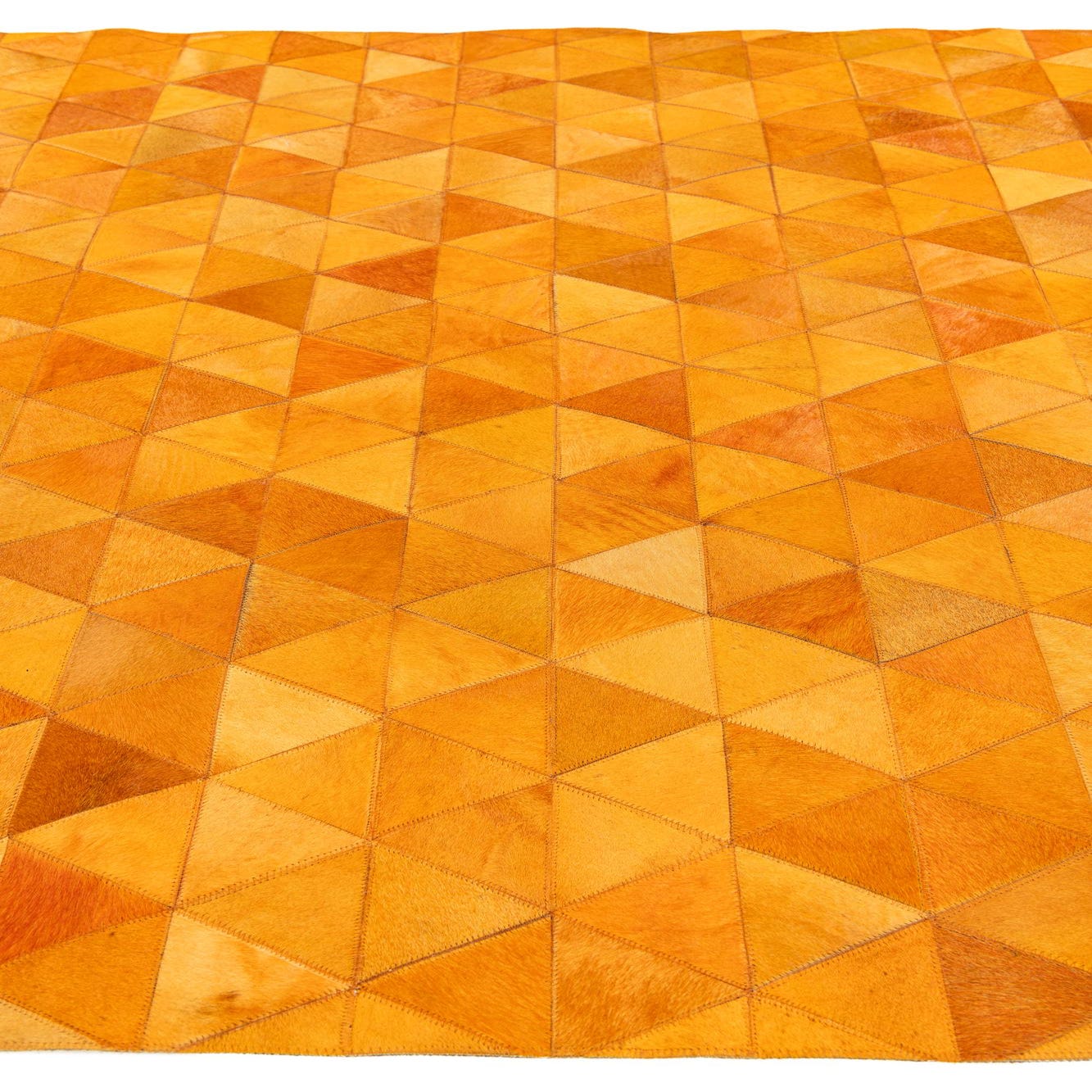 A 5x8 rectangular Cowhide Stocks rug from Rugs.com, featuring a modern geometric pattern of varying yellow and gold triangular patches, perfect for an indoor living space.