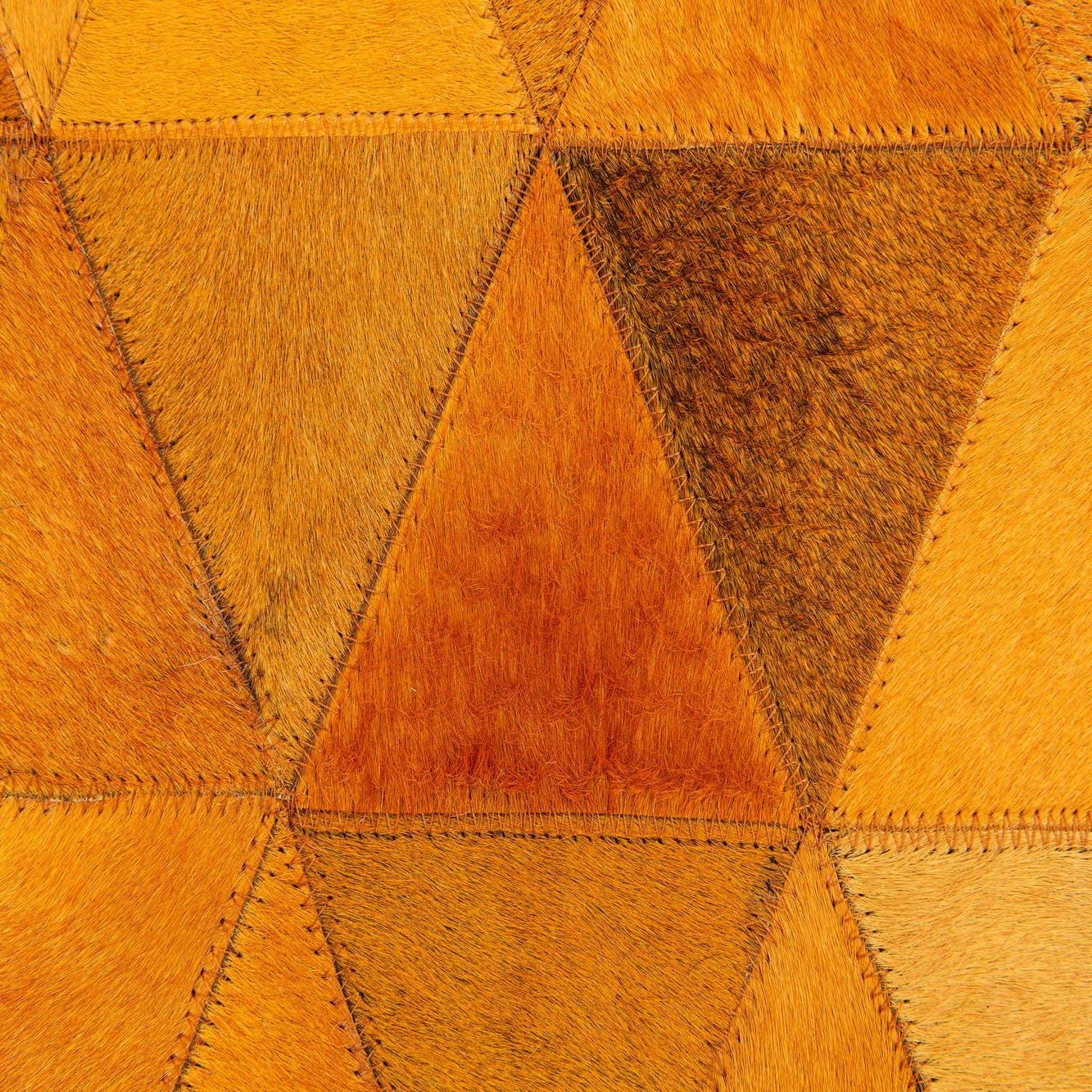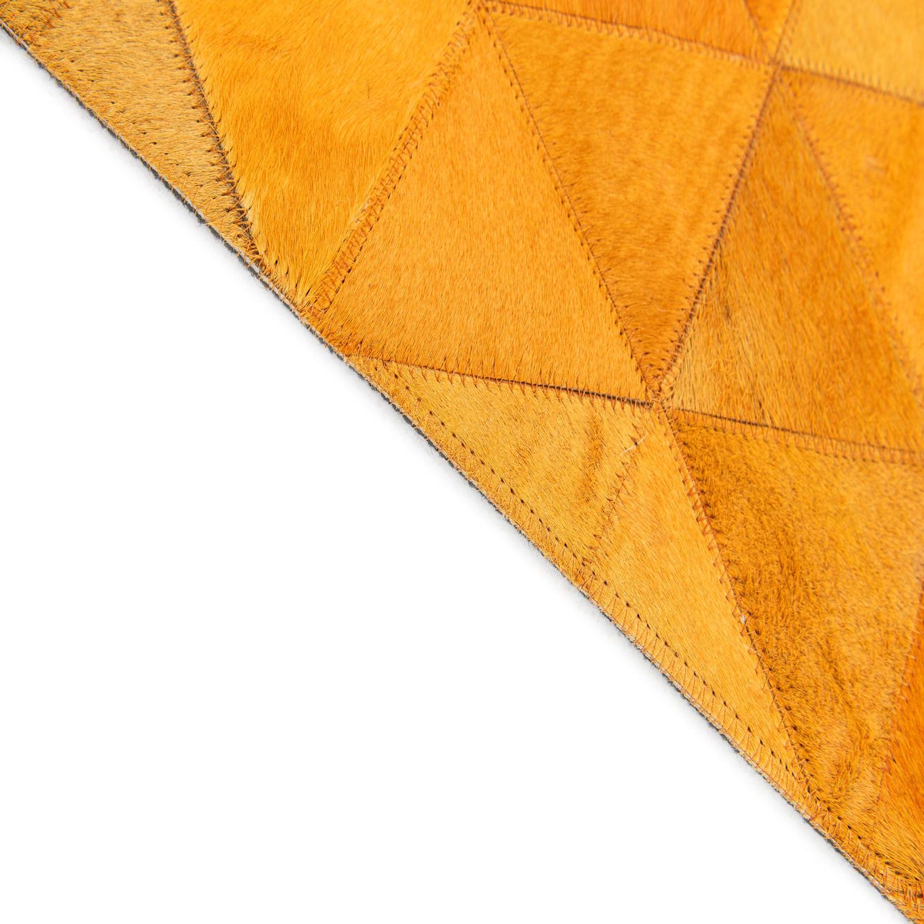 A 5x8 rectangular yellow cowhide rug with a modern geometric pattern of varying golden triangles.