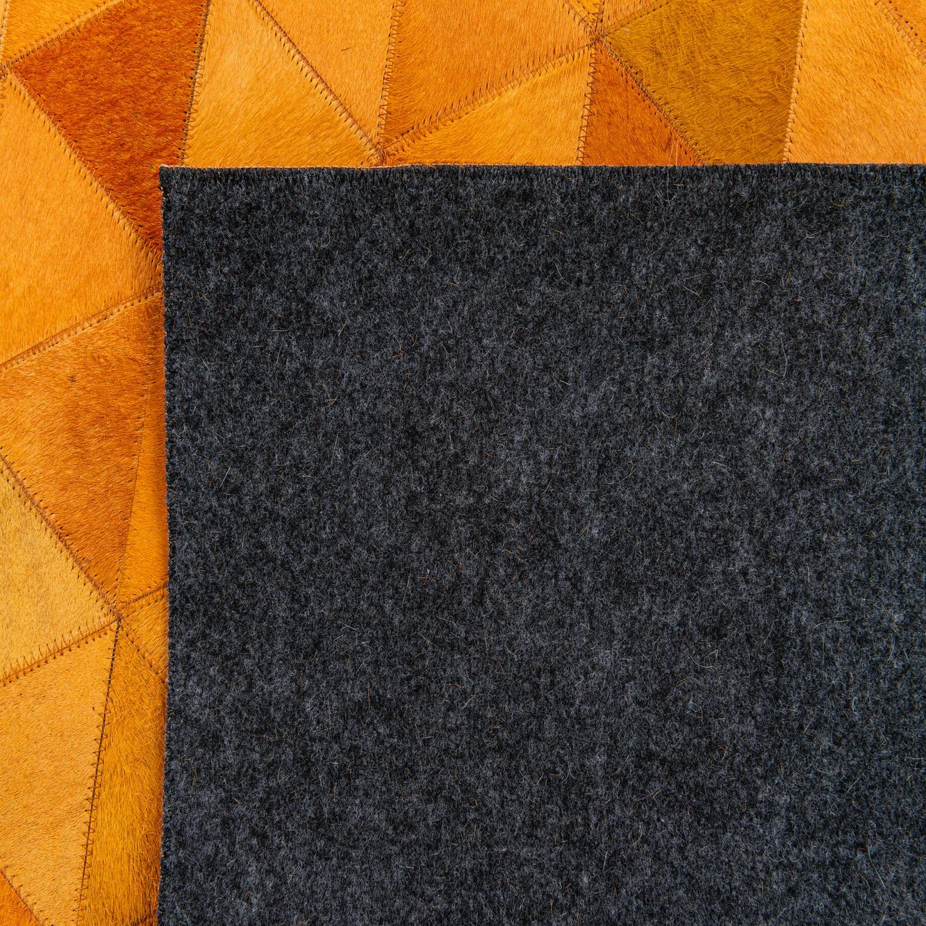 A 5x8 rectangular Cowhide Stocks rug in varying shades of yellow and gold, featuring a modern geometric triangular pattern.