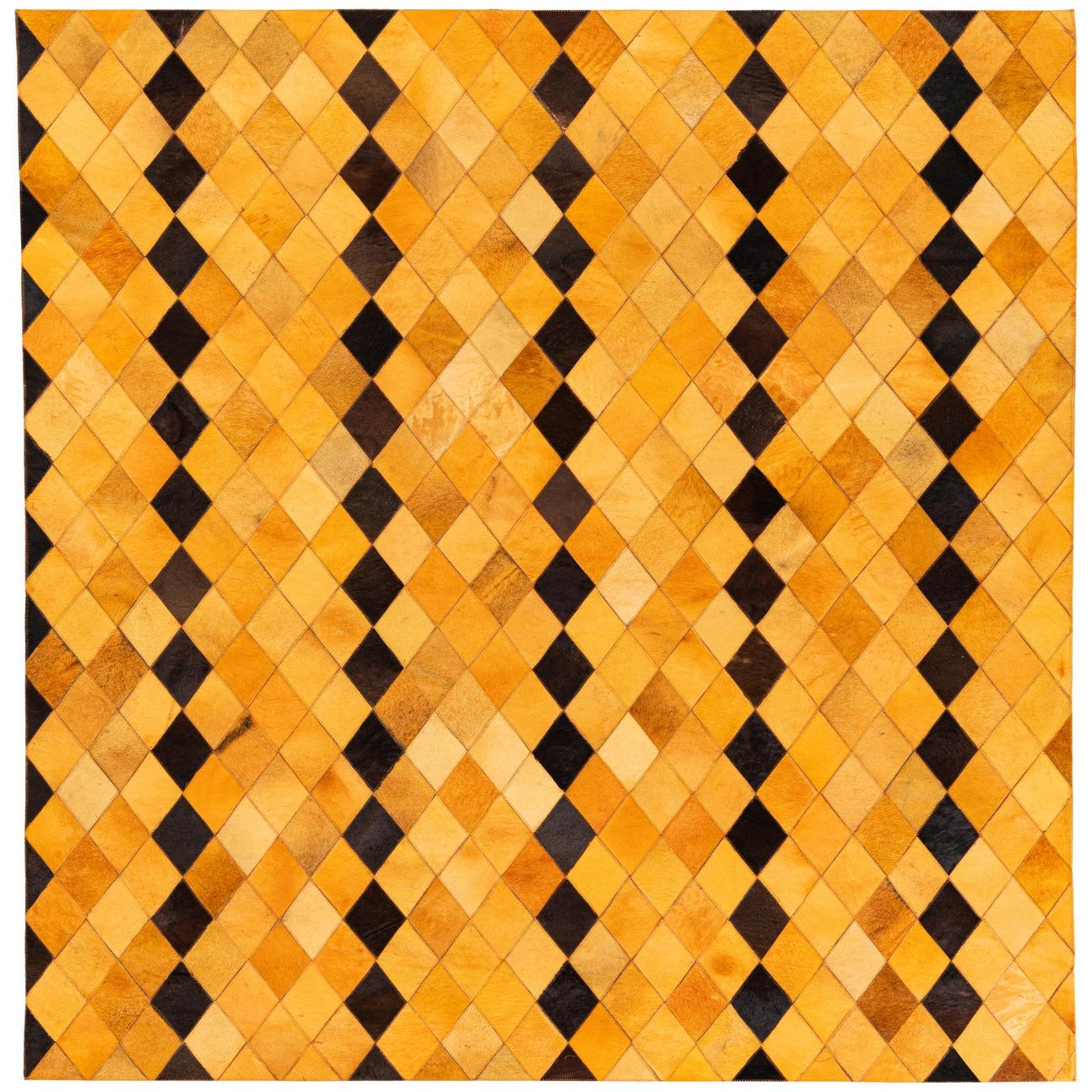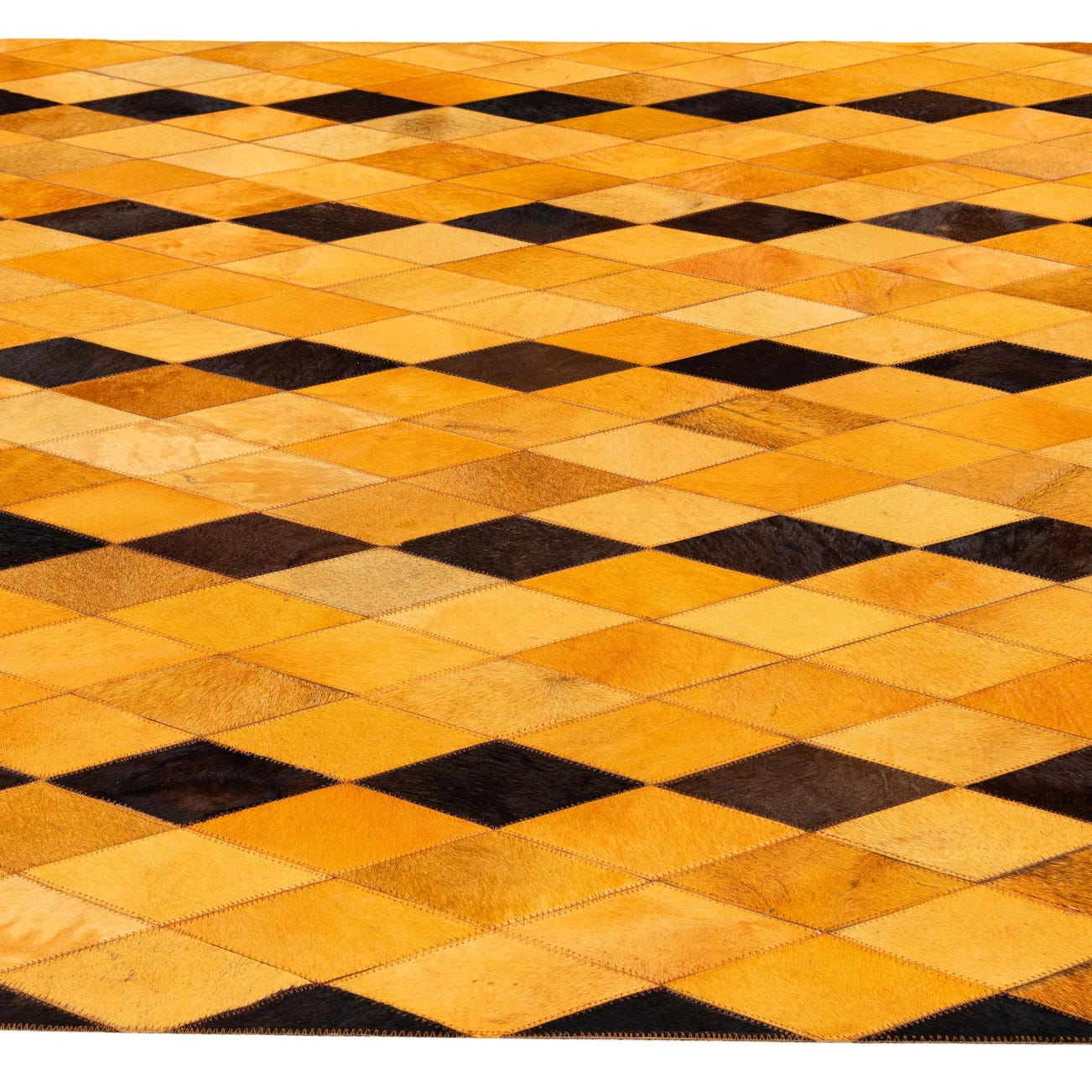 A 5x8 rectangular Cowhide Stocks rug featuring a modern geometric pattern of yellow and gold diamond patches interspersed with black diamonds.