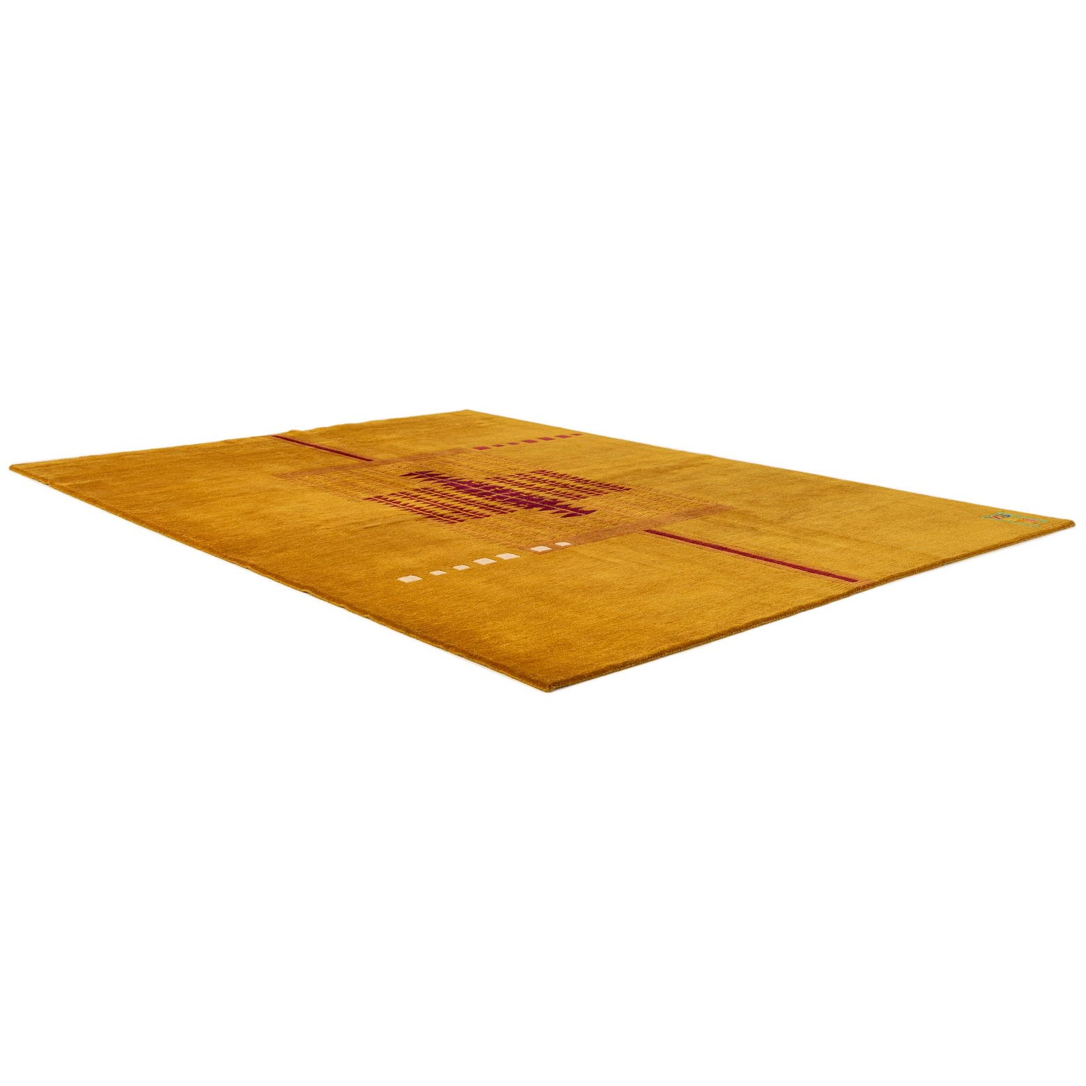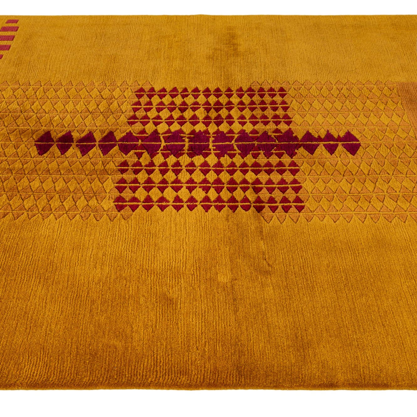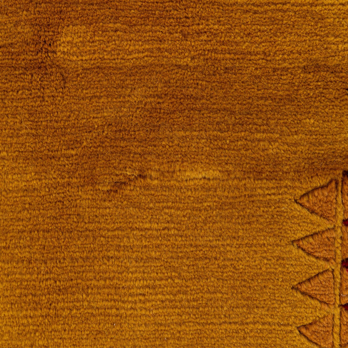 Primary color is Mustard Yellow. Colors in this rug include: Mustard Yellow, Burgundy, Ivory, Orange.