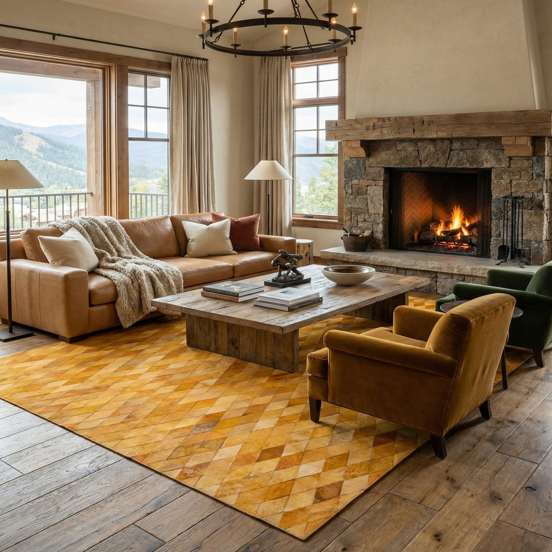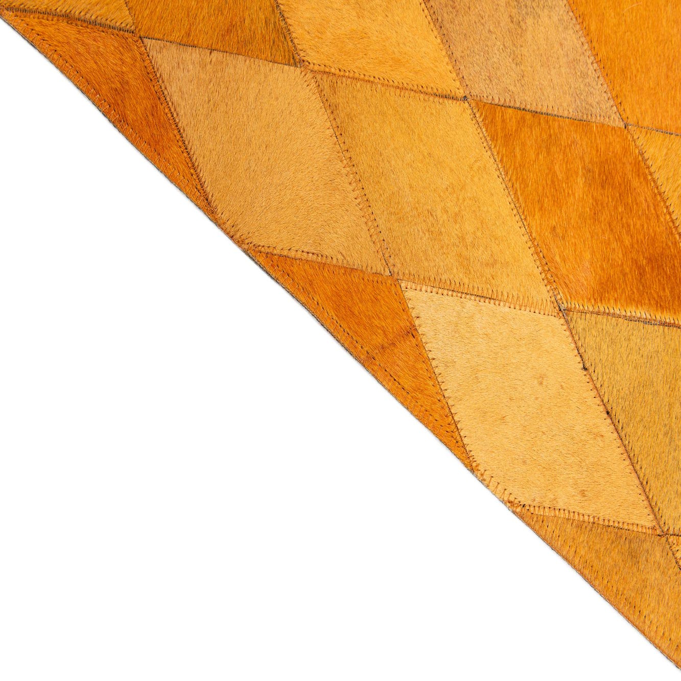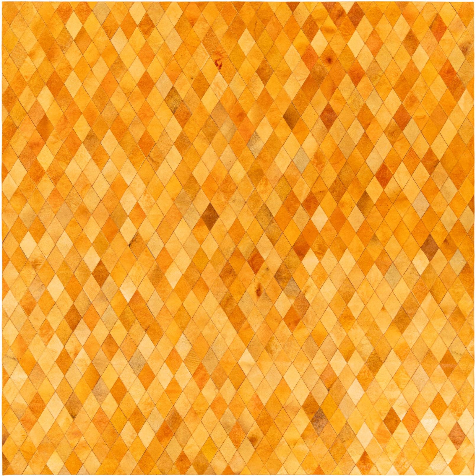 A rectangular 8x10 modern area rug featuring a mosaic of yellow and gold diamond-shaped cowhide patches.