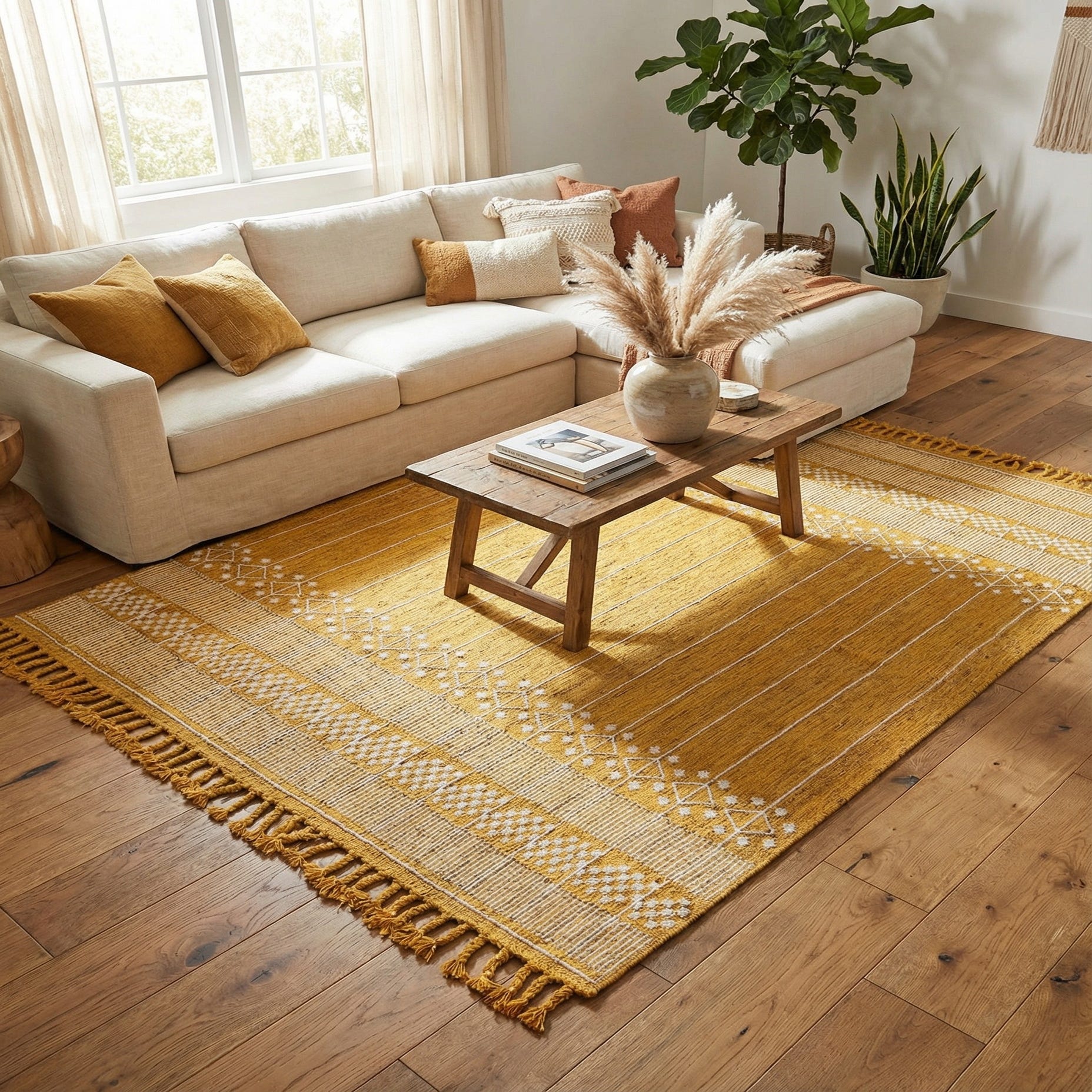 A rectangular 8x10 Eco Bohemian yellow and gold rug with white geometric patterns and stripes, featuring tassels on the ends.