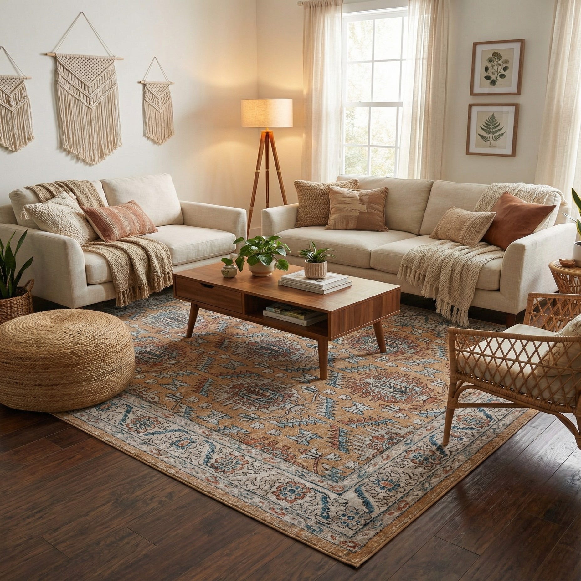Machine-made from 100% polypropylene, this rug has a low, dense pile that feels smooth underfoot and holds crisp detail across the surface. The finish has a soft, timeworn sheen that pairs well with natural wood and mixed metals. Place it beneath a sofa and coffee table in a lived-in living room, anchor a dining area with warm-toned seating, or introduce color and pattern to a home office; it also layers nicely over hardwood or jute for added texture and visual interest.