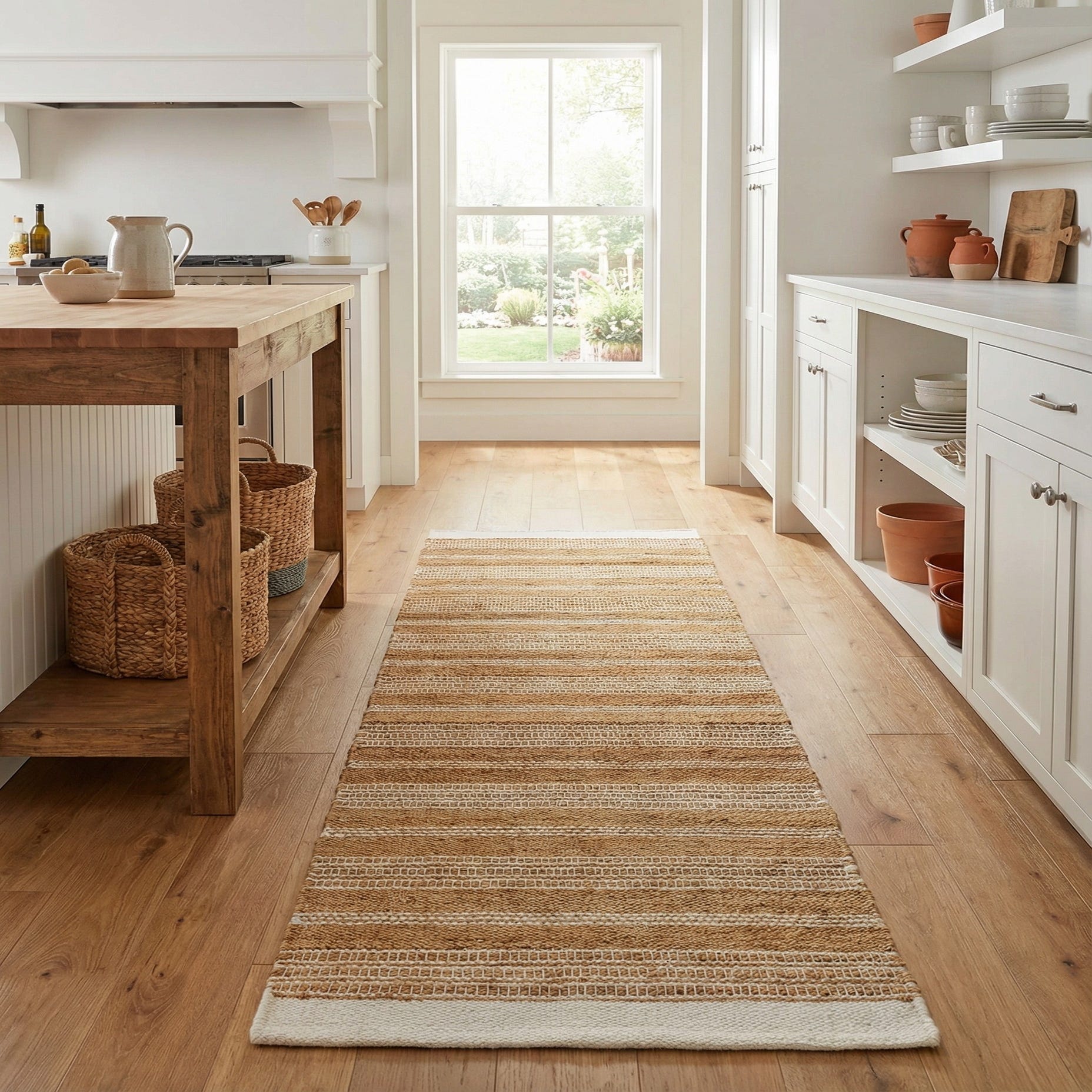 This runner works well in entryways and hallways or layered in front of a sofa or bed to add warmth and tactile interest. It complements coastal, farmhouse, modern rustic, and boho interiors; try it with whitewashed wood floors, rattan or wicker furniture, linen upholstery, leather accents, and plenty of greenery to enhance its natural tones. The straightforward stripe pattern and neutral palette make it easy to integrate into both minimalist and layered design schemes.