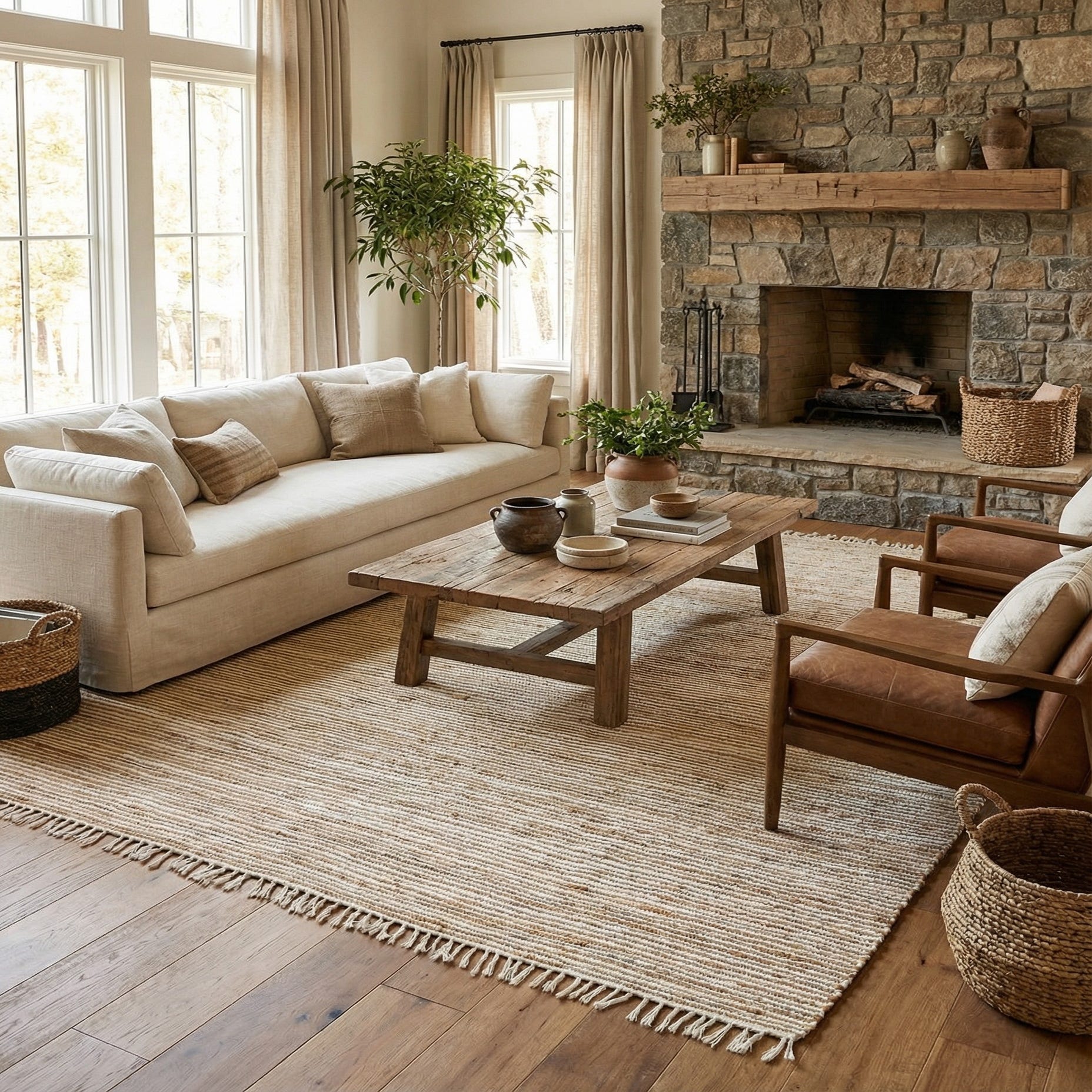 Works well in casual, relaxed interiors — place it beneath a low-profile sofa and coffee table in a living room, anchor a simple dining set, or layer it in a breezy bedroom. Pair it with light woods, linen upholstery, rattan accents, and muted ceramics for a coastal or Scandinavian look, or combine it with distressed wood and metal elements for a modern farmhouse or relaxed boho scheme.