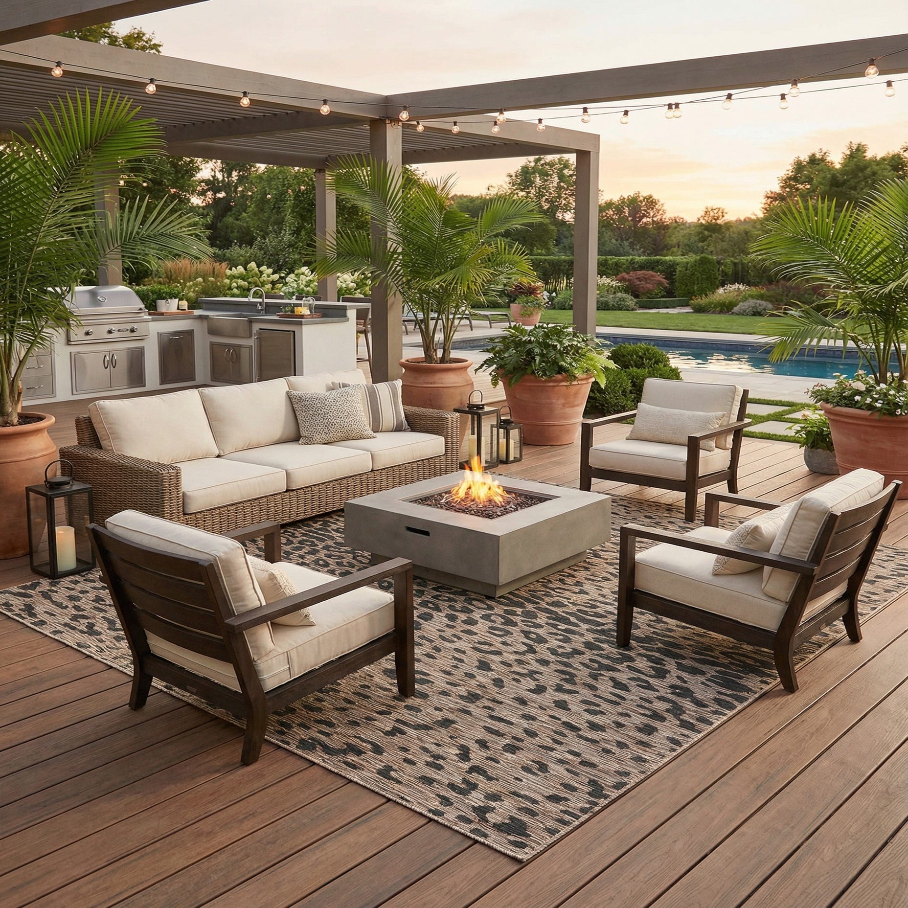 The pattern and color palette are versatile, seamlessly fitting with various decor styles, including contemporary, bohemian, and transitional outdoor settings. This rug could act as a focal point in a minimalist design scheme or complement the layered, textured look of a more eclectic space.