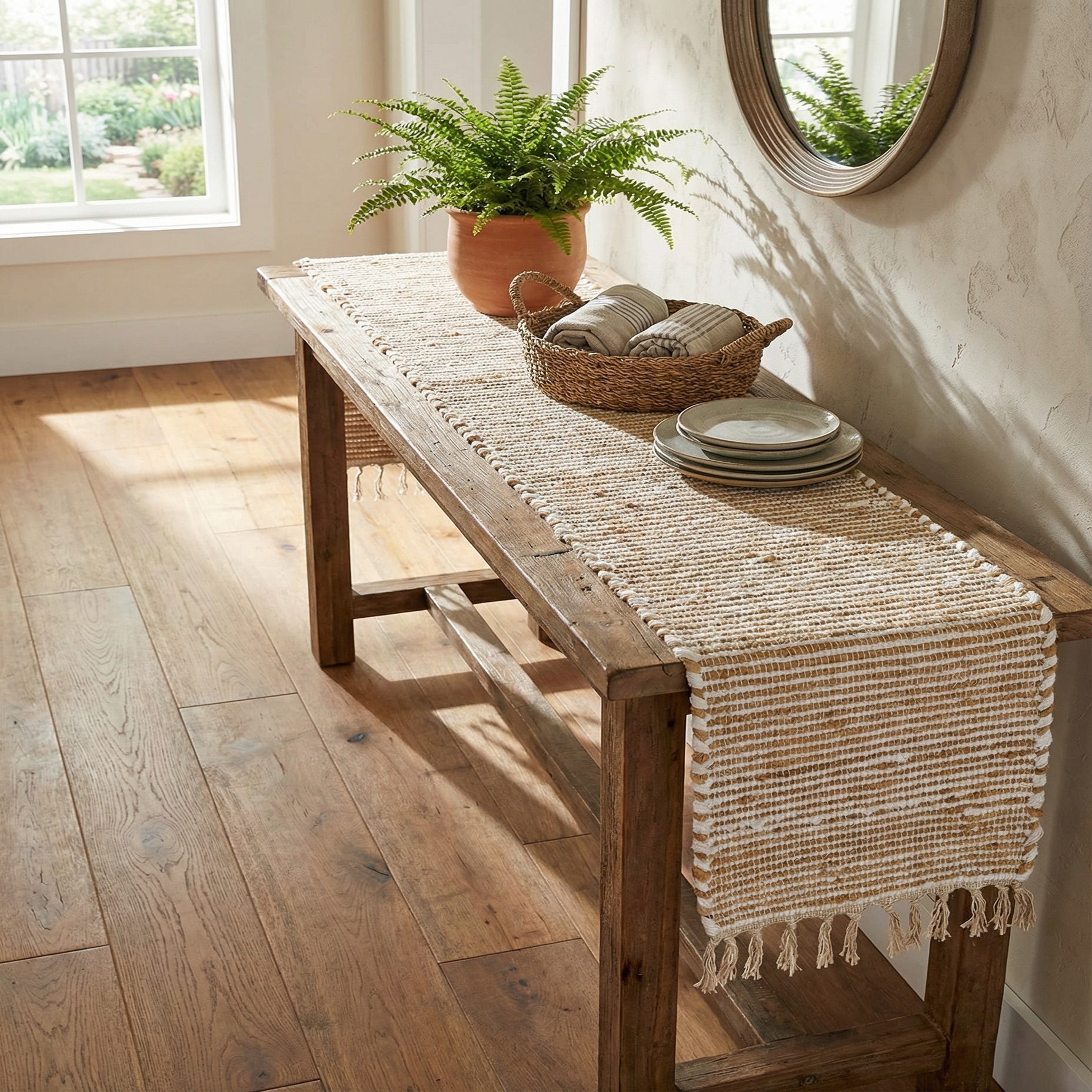 This runner works well on a long dining table, layered down the center of a buffet, or across a console in an entryway. It complements neutral, coastal, Scandinavian, and modern farmhouse schemes, and pairs nicely with raw wood furniture, white or glazed ceramics, linen napkins, and greenery for a relaxed table setting. Use it to add texture and a quiet, natural tone to minimalist or bohemian arrangements alike.