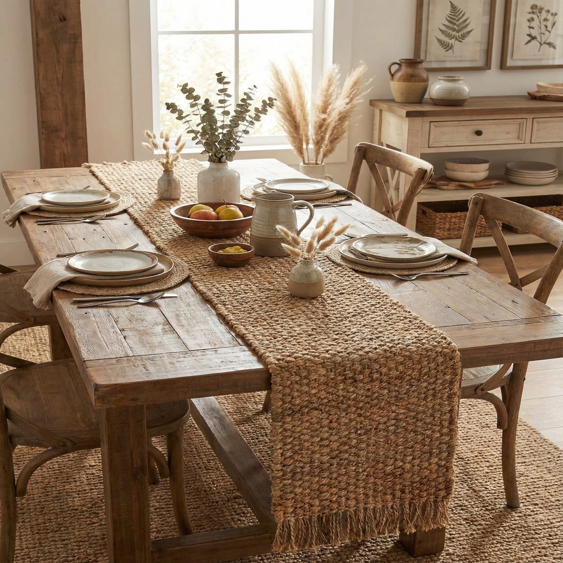 The runner complements a range of interiors — layer it over a reclaimed wood dining table for a farmhouse or coastal feel, use it on a simple modern table to add texture to a minimalist scheme, or place it on a console beneath ceramic vases and woven baskets for a relaxed bohemian vignette. It pairs nicely with linen table linens, matte ceramics, and greenery to enhance an earthy, curated table setting.