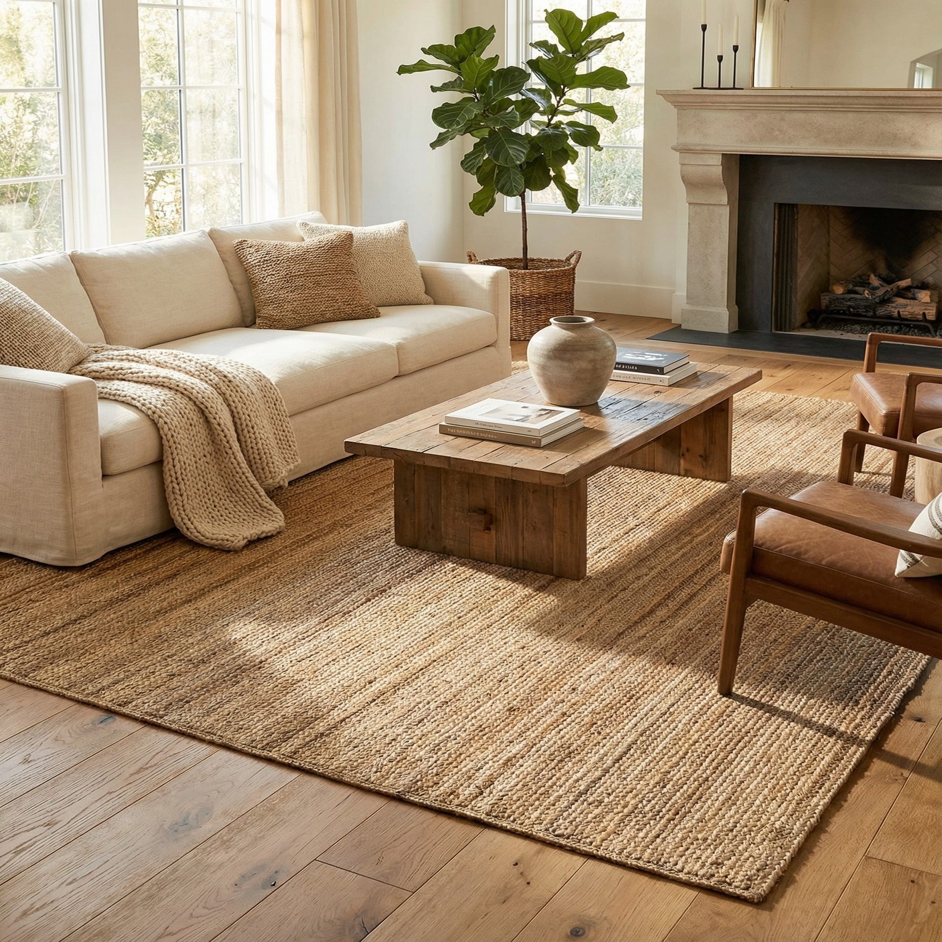 The rug’s relaxed, natural look works well in casual and transitional interiors. Place it under a sectional or coffee table to anchor a living room with wood and leather furnishings, use it beneath a dining table to reinforce a farmhouse or coastal scheme, or layer it in an entry or sunroom for added warmth and texture. Pair with rattan or woven accessories, neutral upholstery, and plenty of greenery for a calm, grounded setting.