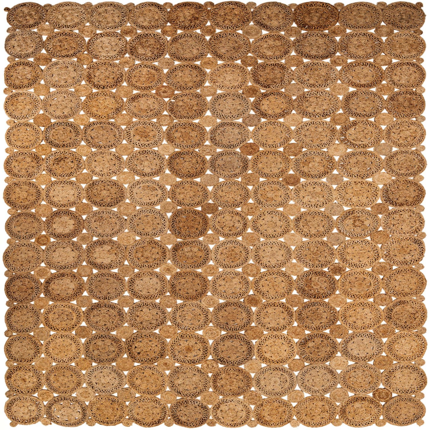 A grid of hand-braided circular medallions creates a rhythmic, tactile surface that draws the eye while staying quietly natural. Each disc is tightly braided from 100% jute, set against a Natural background with warm tan and honey highlights that catch light and add subtle tonal variation. The low-profile weave feels firm underfoot, and the braided construction gives the rug a three-dimensional texture you can see and feel, with small open spaces between motifs that lend an airy, handcrafted look.